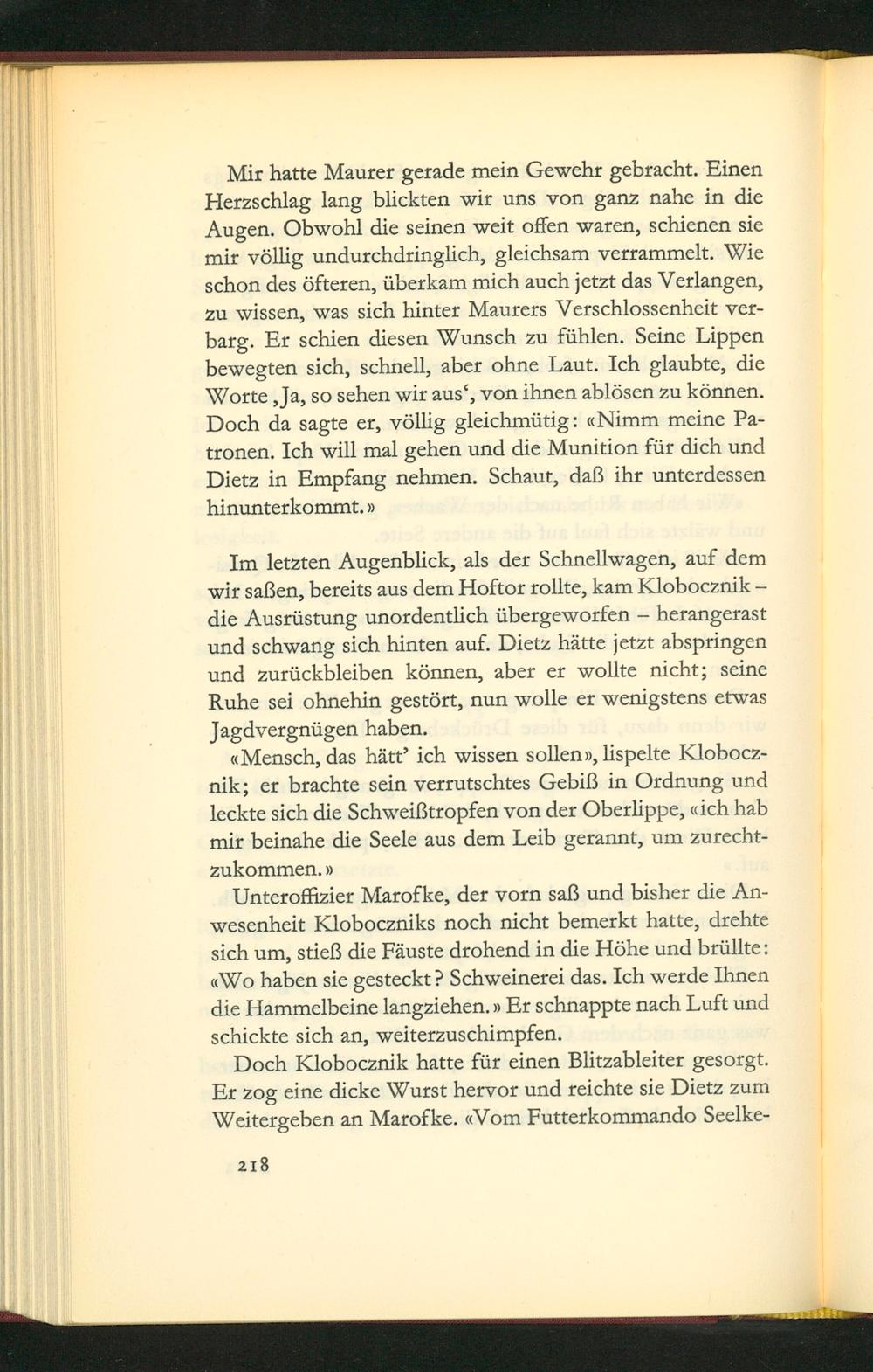 Mir hatte Maurer gerade mein Gewehr gebracht. Einen Herzschlag lang blickten wir uns von ganz nahe in die Augen. Obwohl die seinen weit offen waren, schienen sie mir völlig undurchdringlich, gleichsam verrammelt. Wie schon des õfteren, überkam mich auch jetzt das Verlangen, zu wissen, was sich hinter Maurers Verschlossenheit ver- barg. Er schien diesen Wunsch zu fühlen. Seine Lippen bewegten sich, schnell, aber ohne Laut. Ich glaubte, die Worte, Ja, so Schen wir aus?, von ihnen ablõsen zu können. Doch da sagte er, völlig gleichmütig: Nimm meine Pa- tronen. Ich will mal gehen und die Munition für dich und Dietz in Empfang nehmen. Schaut, daß ihr unterdessen hinunterkommt.