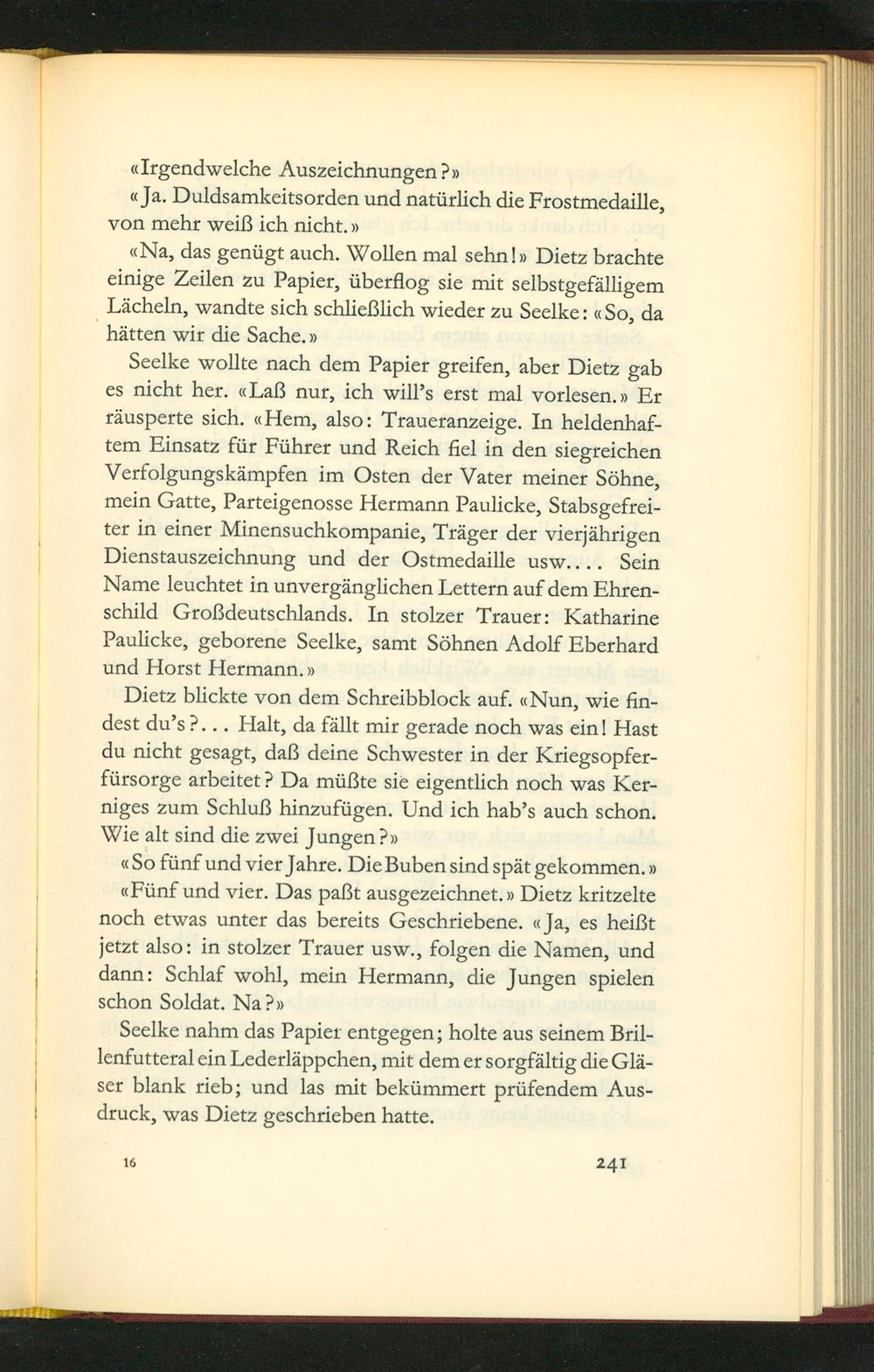 Irgendwelche Auszeichnungen dv ¶Ja. Duldsamkeitsorden und natürlich die Frostmedaille, von meht weiß ich nicht.v Na, das genũgt auch. Wollen mal sehnv Dietz prachte einige Zeilen zu Papier, überflog sie mit selbstgefälligem Lächeln, wandte sich schließlich wieder zu Seelke: cSo, da hätten wir die Sache.v Scelke wollte nach dem Papier greifen, aber Dietz gab es nicht her. Laß nur, ich will's erst mal vorlesen.v Er rãusperte sich. Hem, also: Traueranzeige. In heldenhaf- tem Pinsatz für Führer und Reich fiel in den siegreichen Verfolgungskãmpfen im Osten der Vater meiner Sõhne, mein Gatte, Parteigenosse Hermann Paulicke, Stabsgefrei- ter in einer Minensuchkompanie, Träger der vierjãhrigen Dienstauszeichnung und der Ostmedaille usw.... Sein Name leuchtet in unvergãnglichen Lettern auf dem Ehren- Schild Großdeutschlands. In stolzer Trauer: Katharine Paulicke, geborene Seelke, samt Söhnen Adolf Eberhard und Horst Hermann. v Pietz blickte von dem Schreibblock auf. Nun, wie fin- dest du'sd... Halt, da fällt mir gerade noch was ein! Hast du nicht gesagt, daß deine Schwester in der Kriegsopfer- fürsorge arbeitet? Da můßte sie eigentlich noch was Ker- niges zum Schluß hinzufügen. Und ich hab's auch schon. Wie alt sind die ⁊wei Jungen?v do fünf und vier Jahre. Die Buben sind spãt gekommen. v Fünf᷑ und vier. Das paßt ausgezeichnet. v Pietz kritzelte noch etwas unter das bereits Geschriebene. ¶Ja, es heißt jetzt also: in stolzer Trauer usw., folgen die Namen, und dann: Schlaf wohl, mein Hermann, die Jungen spielen Schon Soldat. Na?v Scelke nahm das Papier entgegen; holte aus seinem Bril- lenfutteral ein Lederlãppchen, mit dem er sorgfãltig die Glã- ser blank rich; und las mit bekümmert prüũfendem Aus- druck, was Dietz geschrieben hatte.