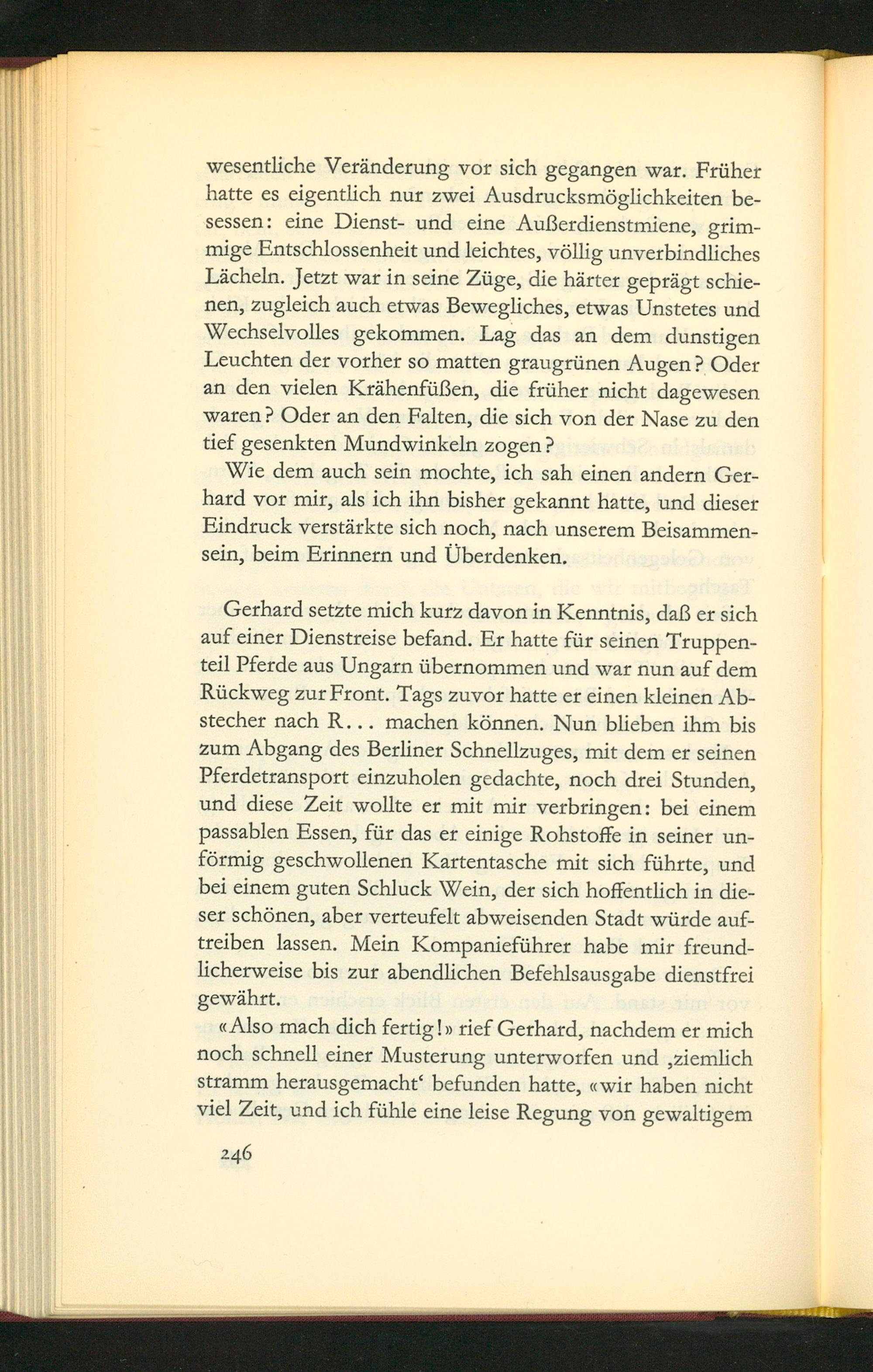 Gerhard setzte mich kurz davon in Kenntnis, daß er sich aut᷑ einer Pienstreise hefand. Er hatte für seinen Truppen- teil Pferde aus Ungarn übernommen und war nun auf dem Rückweg zur Front. Tags zuvor hatte er einen kleinen Ab- stecher nach R... machen können. Nun blieben ihm bis zum Abgang des Berliner Schnellæzuges, mit dem er seinen Pferdetransport einzuholen gedachte, noch drei Stunden, und diese Zeit wollte er mit mir verbringen: bei einem passablen Essen, für das er einige Rohstoffe in seiner un- fõrmig geschwollenen Kartentasche mit sich führte, und bei einem guten Schluck Wein, der sich hoffentlich in die- ser schönen, aber verteufelt abweisenden Stadt würde auf- treiben lassen. Mein Kompanieführer habe mir freund- licherweise bis zur abendlichen Befehlsausgabe dienstfrei gewährt.