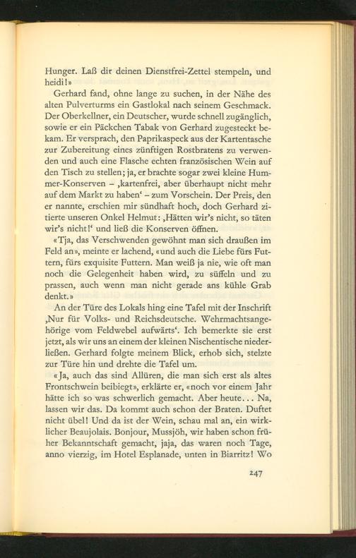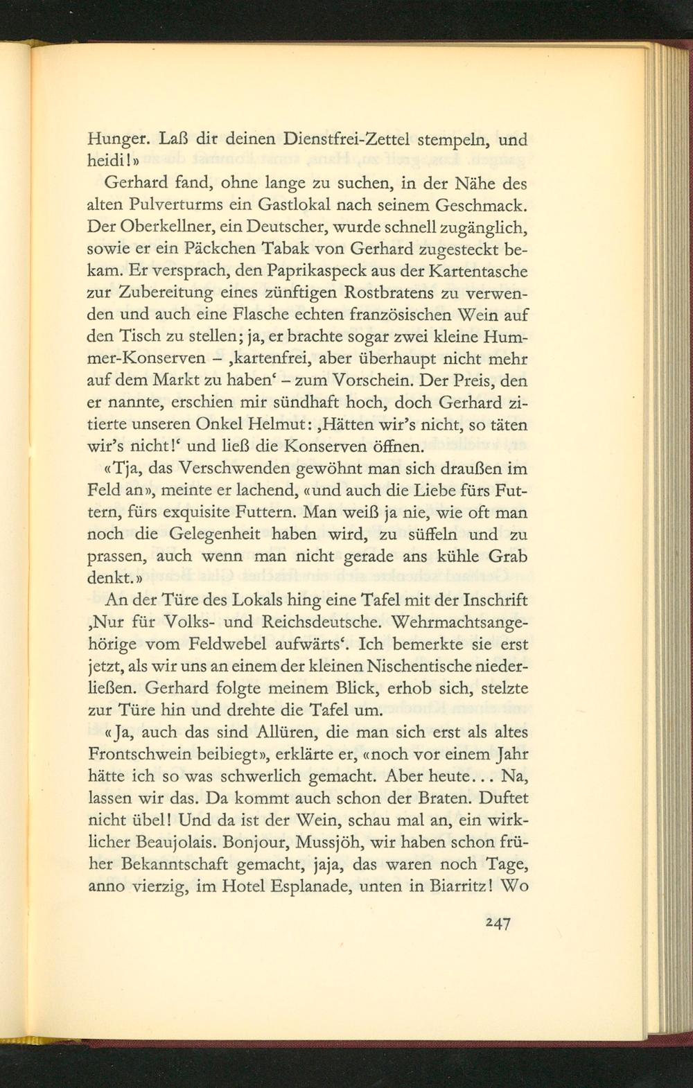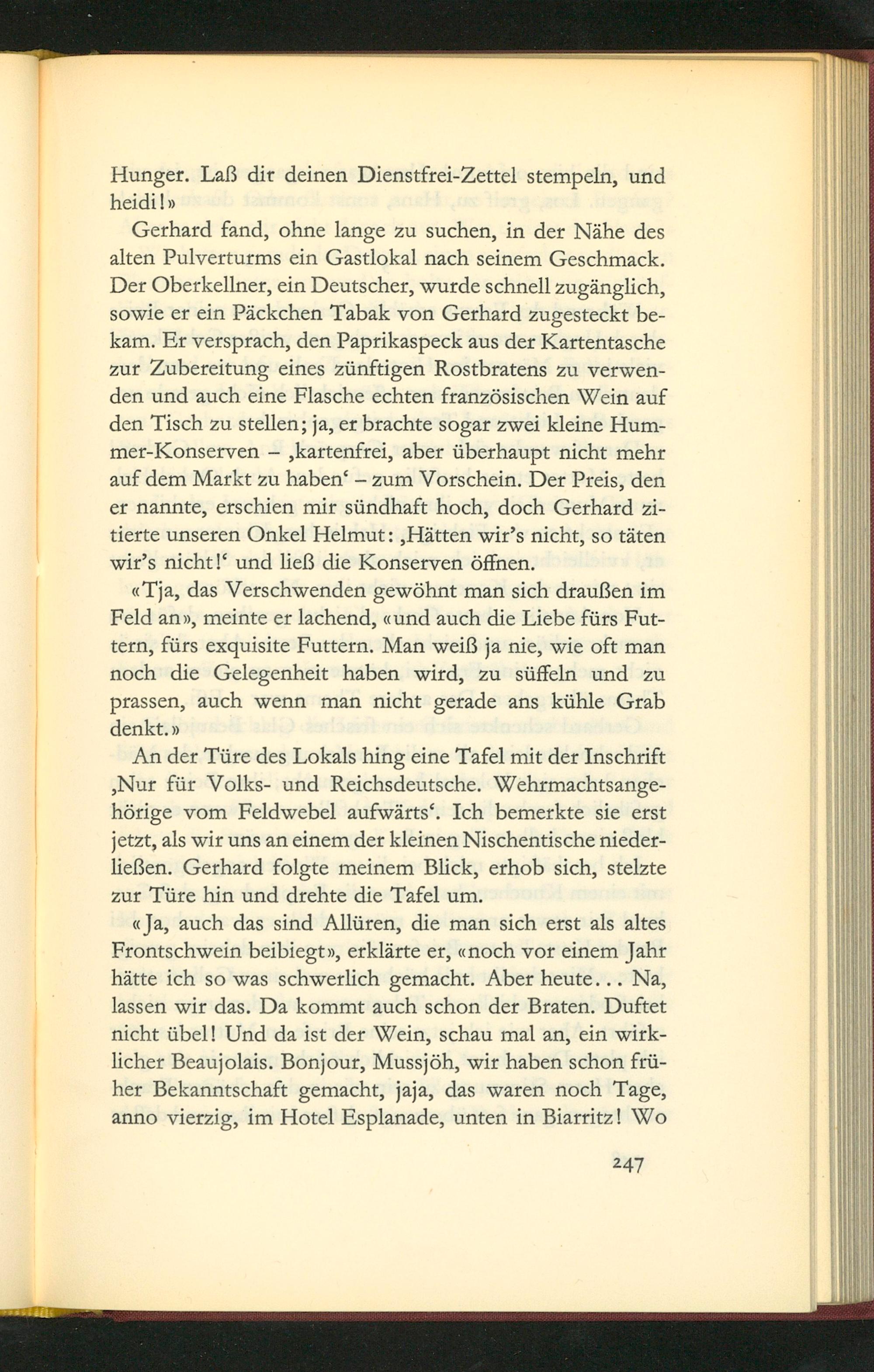 An der Türe des Lokals hing eine Tafel mit der Inschrift „Nur für Volks- und Reichsdeutsche. Wehrmachtsange- hörige vom Feldwebel aufwärts“. Ich bemerkte sie erst jetzt, als wir uns an einem der kleinen Nischentische nieder- ließen. Gerhard folgte meinem Blick, erhob sich, stelzte zur Türe hin und drehte die Tafel um.