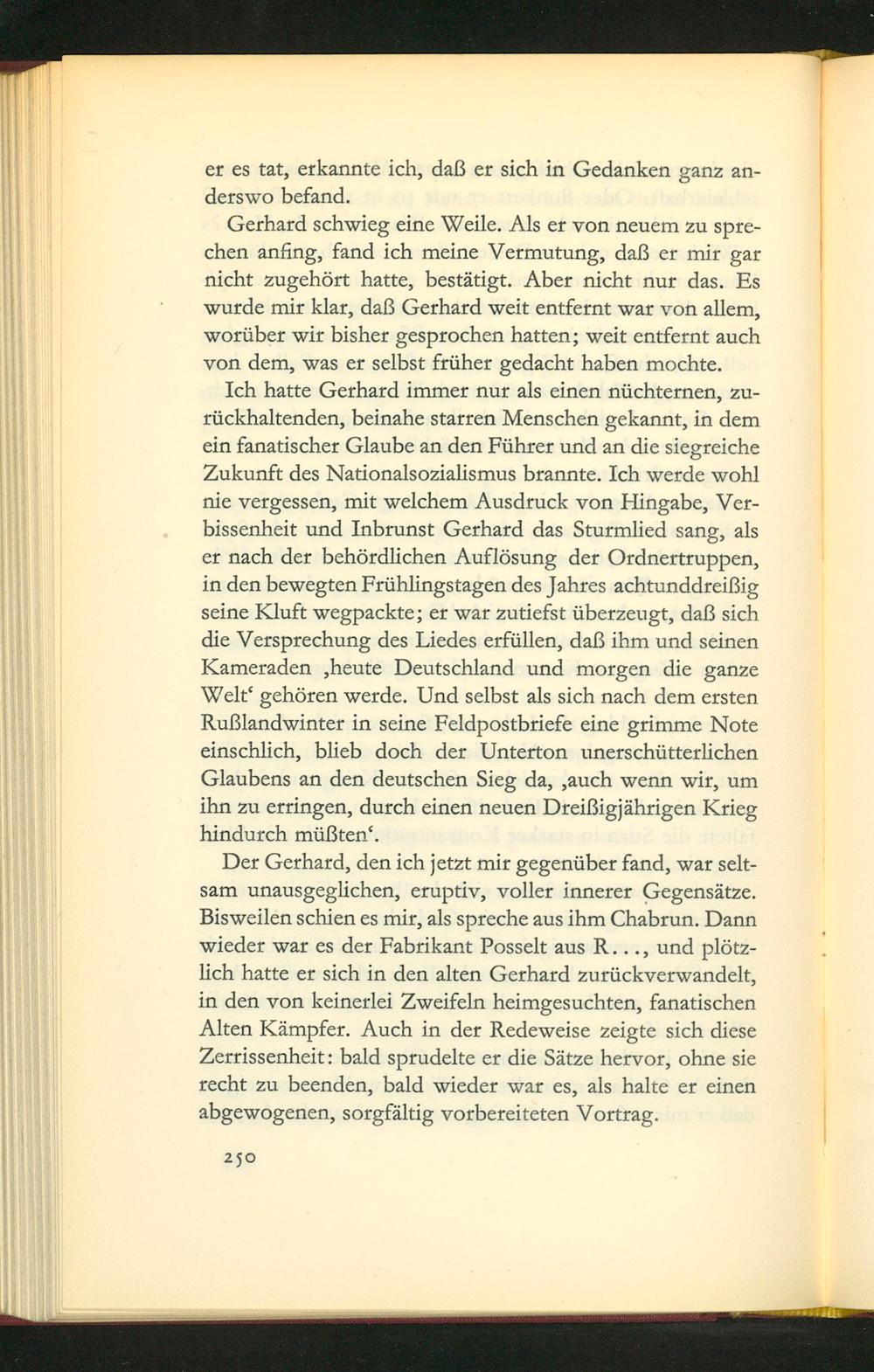 Ich hatte Gerhard immer nur als einen nüchternen, zu- rũckhaltenden, beinahe starren Menschen gekannt, in dem ein fanatischer Glaube an den Fũhrer und an die siegreiche Zukunft des Nationalsozialismus brannte. Ich werde wohl nie vergessen, mit welchem Ausdruck von Hingabe, Ver- bissenheit und Inbrunst Gerhard das Sturmlied sang, als er nach der behördlichen Auflösung der Ordnertruppen, in den bewegten Frũhlingstagen des Jahres achtunddreißig seine Kluft wegpackte; er war zutiefst überzeugt, daß sich die Versprechung des Liedes erfüllen, daß ihm und seinen Kameraden„heute Deutschland und morgen die ganze Welt' gehören werde. Und selbst als sich nach dem ersten Rußlandwinter in seine Feldpostbriefe eine grimme Note einschlich, blieb doch der Unterton unerschütterlichen Glaubens an den deutschen Sieg da, ,auch wenn wir, um ihn zu erringen, durch einen neuen Dreißigjãhrigen Krieg hindurch müßten.