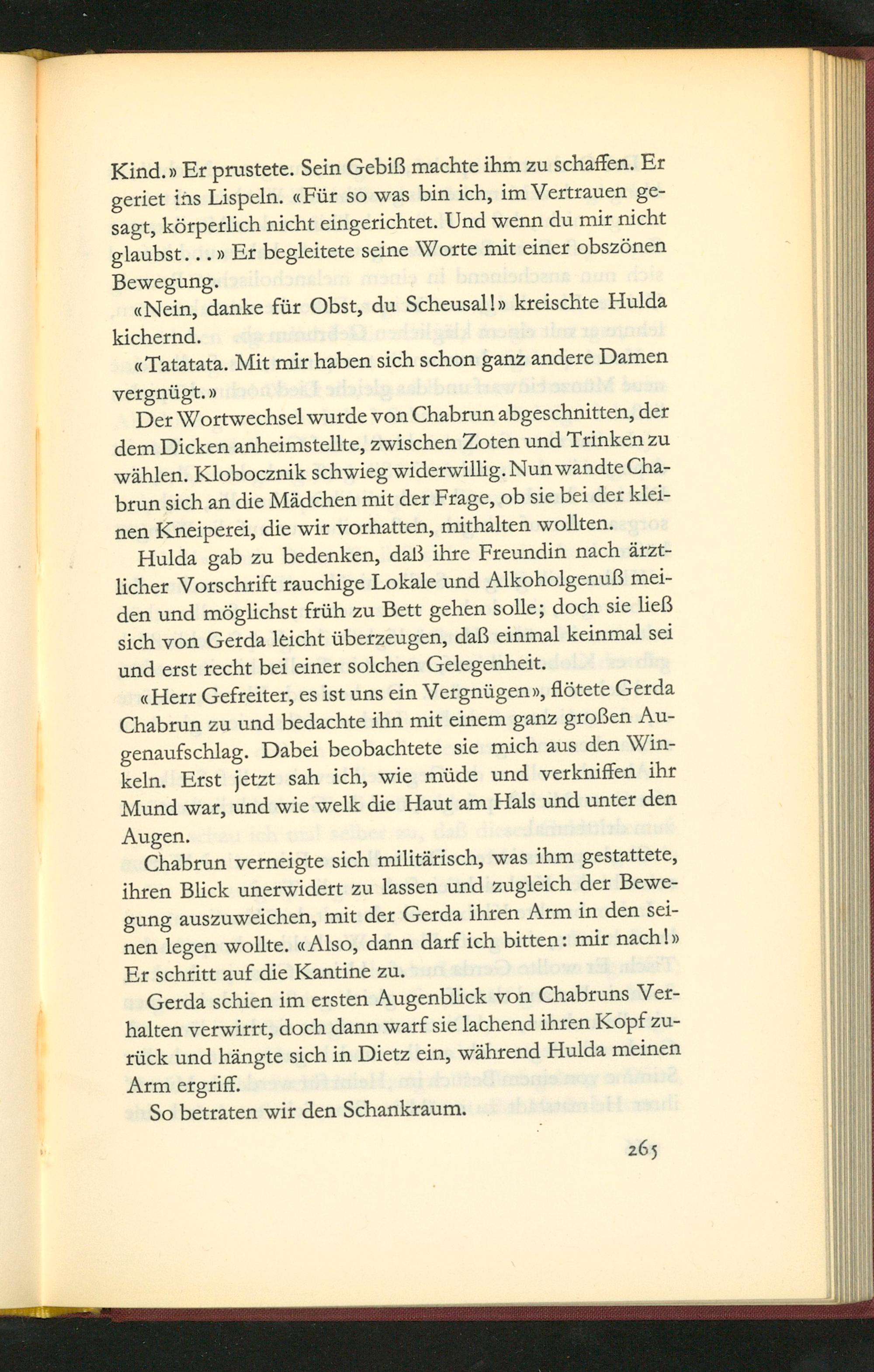 Kind. v Er prustete. Sein Gepiß machte ihm zu schaffen. Er geriet ins Lispeln. Für so was bin ich, im Vertrauen ge- sagt, körperlich nicht eingerichtet. Und wenn du mir nicht glaubst... vEr pegleitete seine Worte mit einer obszõnen Bewegung.