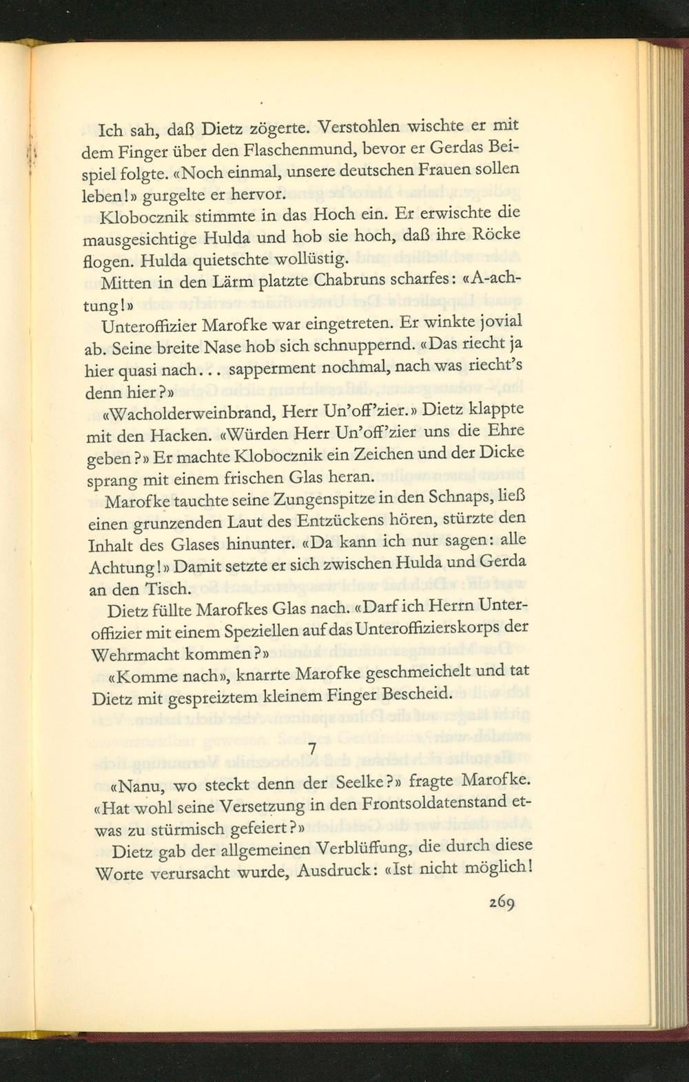 Ich sah, daß Dietz zögerte. Verstohlen wischte er mit dem Finger ũber den Flaschenmund, bevor er Gerdas Bei- spiel folgte. Noch einmal, unsere deutschen Frauen sollen leben lv gurgelte er hervor.