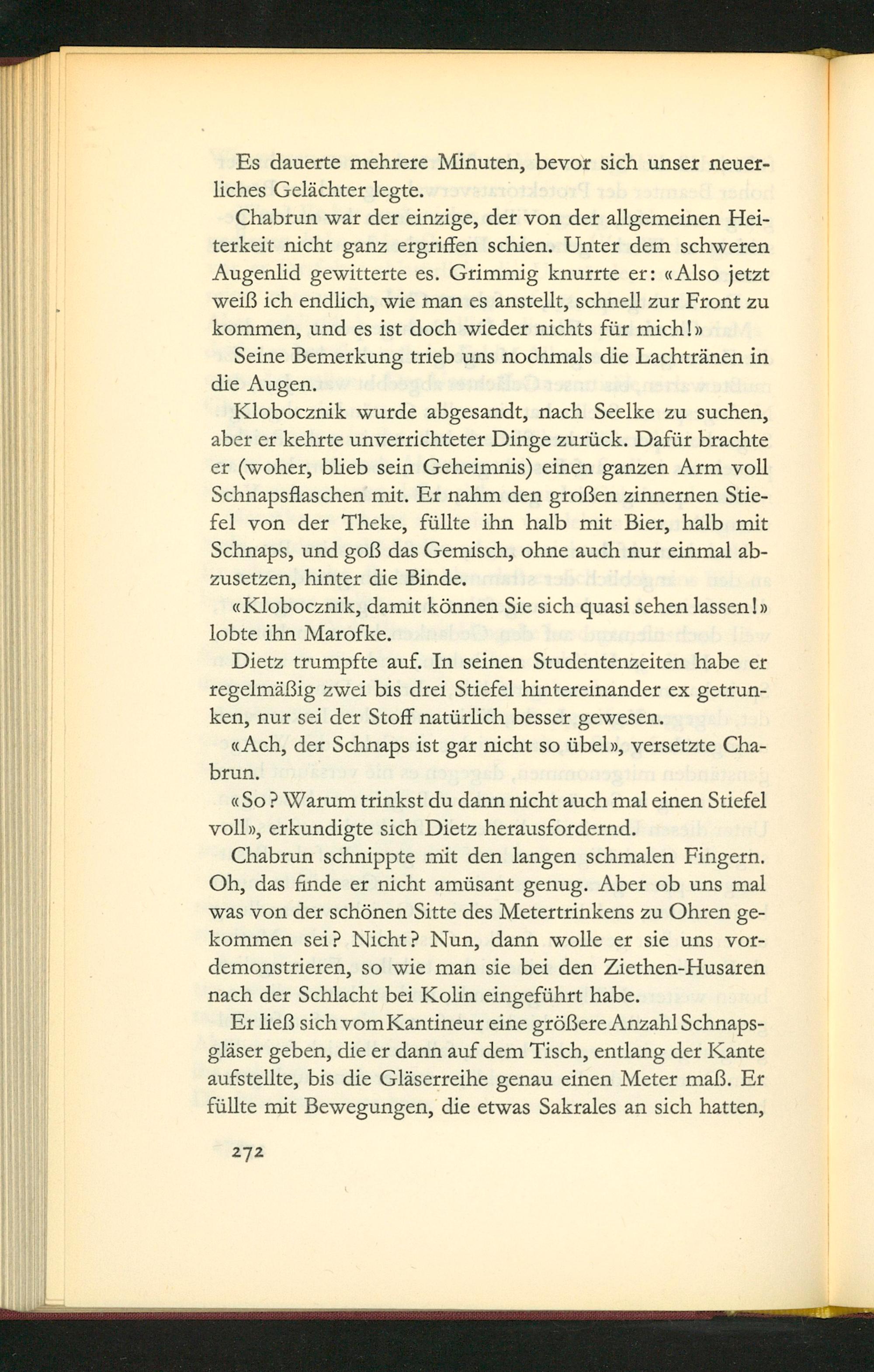 Klobocznik wurde abgesandt, nach Seelke zu suchen, aber er kehrte unverrichteter Dinge zurück. Dafür brachte er(woher, blieb sein Geheimnis) einen ganzen Arm voll Schnapsflaschen mit. Er nahm den großen zinnernen Stie- fel von der Theke, füllte ihn halb mit Bier, halb mit Schnaps, und goß das Gemisch, ohne auch nur einmal ab- zusetzen, hinter die Binde.