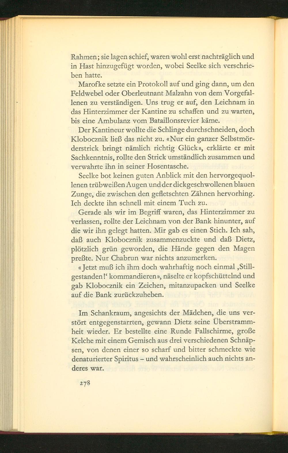 Der Kantineur wollte die Schlinge durchschneiden, doch Klobocznik ließ das nicht zu. Nur ein ganzer Selbstmör- derstrick bringt nämlich richtig Glückv, erklärte er mit Sachkenntnis, rollte den Strick umstãndlich zusammen und verwahrte ihn in seiner Hosentasche.