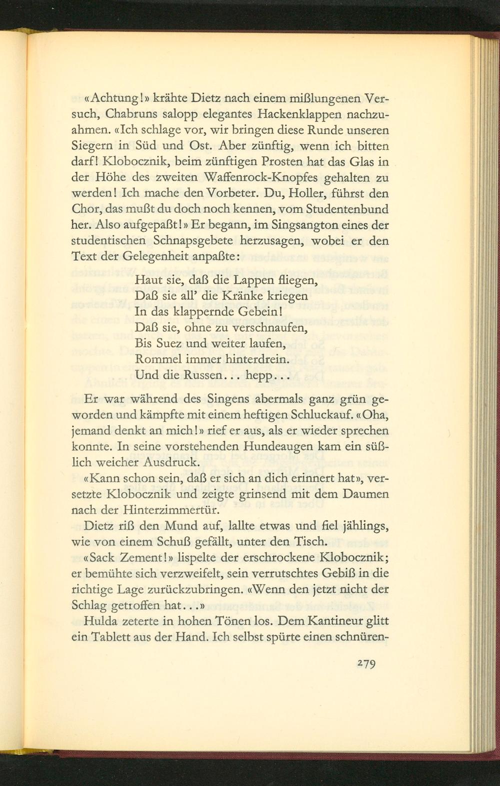 Achtunglv krähte Dietz nach einem mißlungenen Ver- such, Chabruns salopp elegantes Hackenklappen nachzu- ahmen. aIch schlage vor, wir bringen diese Runde unseren Siegern in Süd und Ost. Aber zünftig, wenn ich bitten darf! Klobocznik, beim zünftigen Prosten hat das Glas in der Höhe des zweiten Waffenrock-Knopfes gehalten zu werden! Ich mache den Vorbeter. Du, Holler, führst den Chor, das mußt du doch noch kennen, vom Studentenbund her. Also aufgepaßt l* Er begann, im Singsangton eines der studentischen Schnapsgebete herzusagen, wobei er den Text der Gelegenheit anpaßte: