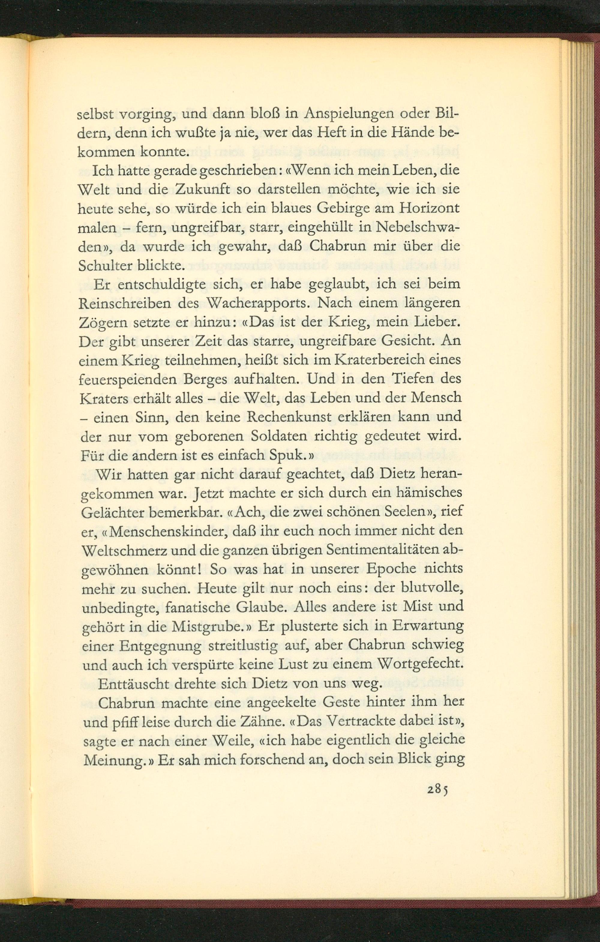 Ich hatte gerade geschrieben: Wenn ich mein Leben, die Welt und die Zukunft so darstellen möchte, wie ich sie heute sche, so würde ich ein blaues Gebirge am Horizont malen— fern, ungreifbar, starr, eingehüllt in Nebelschwa- denꝰ, da wurde ich gewahr, daß Chabrun mir über die Schulter blickte.