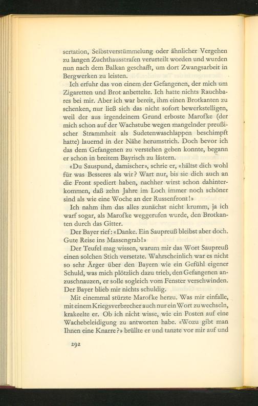 Der Teufel mag wissen, warum mir das Wort Saupreuß einen solchen Stich versetzte. Wahrscheinlich war es nicht so schr Arger über den Bayern wie ein Gefühl eigener Schuld, was mich plõtzlich dazu trieb, den Gefangenen an- zuschnauzen, er solle sogleich vom Fenster verschwinden. Der Bayer blieb mir nichts schuldig.
