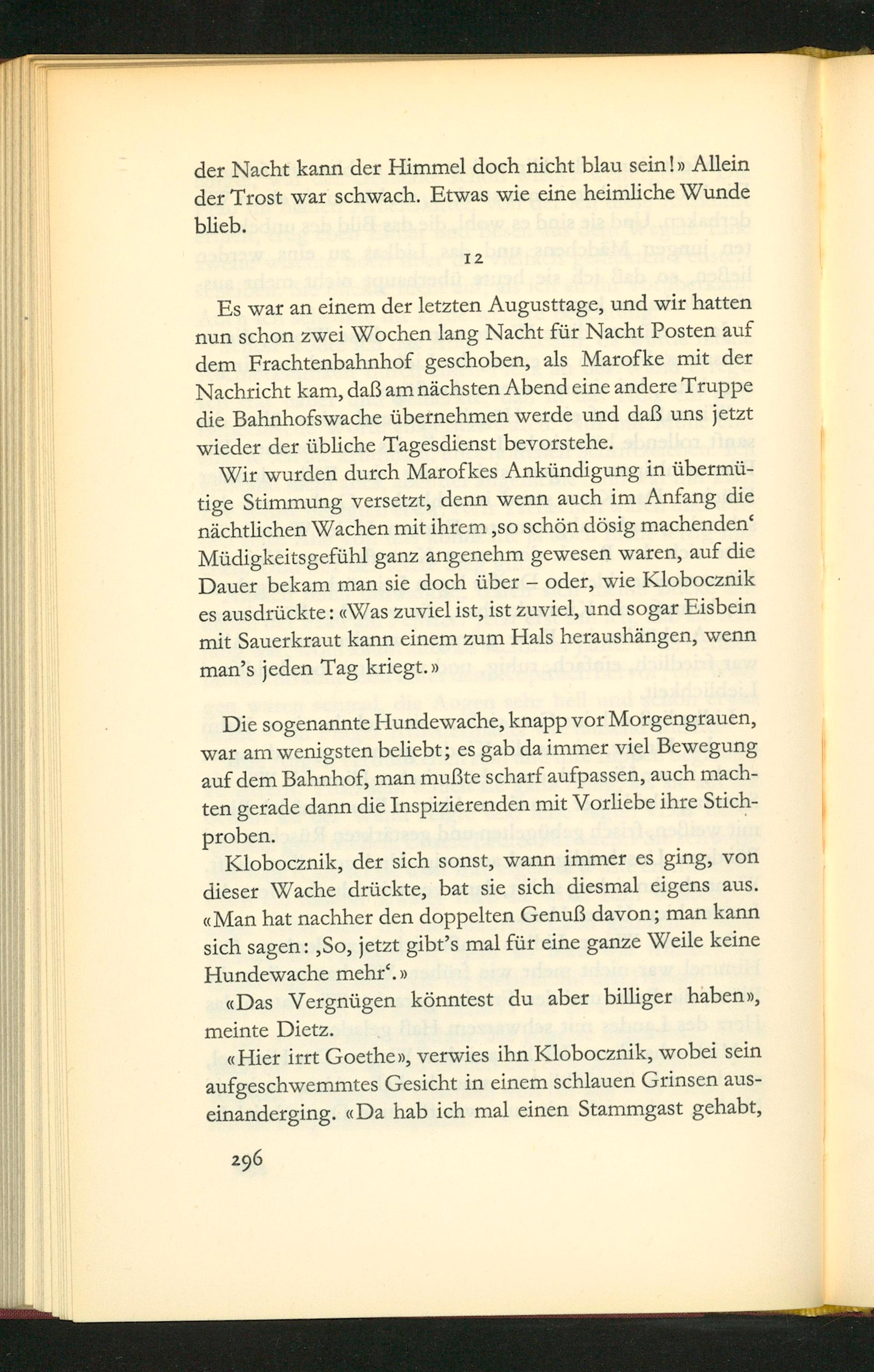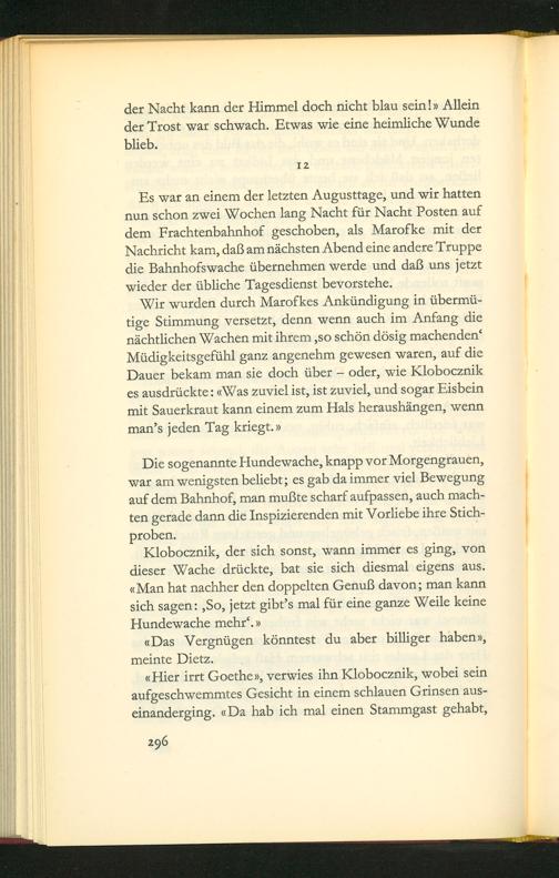 Klobocznik, der sich sonst, wann immer es ging, von dieser Wache drückte, bat sie sich diesmal eigens aus. Man hat nachher den doppelten Genuß davon; man kann sich sagen:, So, jetzt gibt's mal für eine ganze Weile keine Hundewache mehr?.*