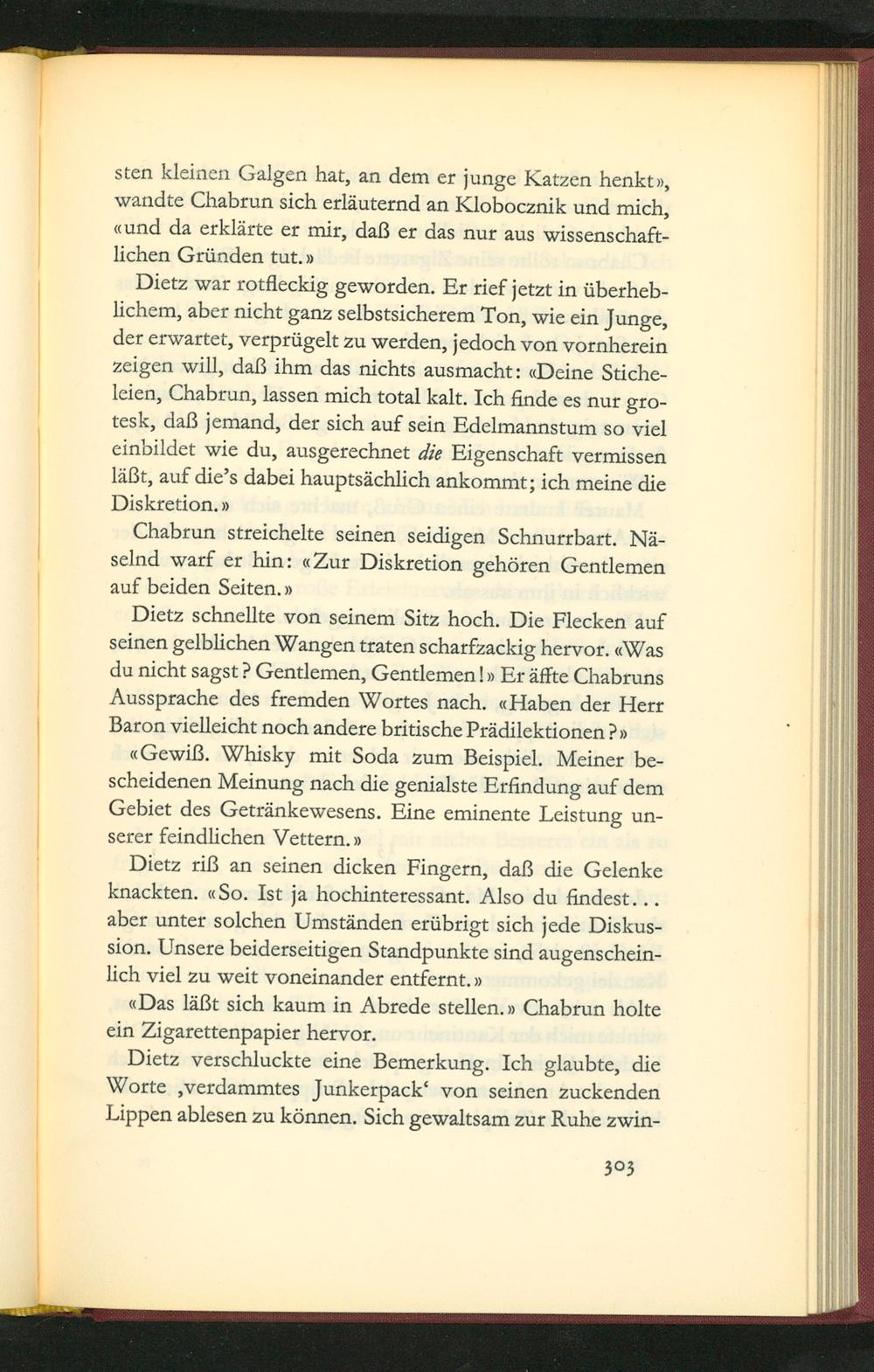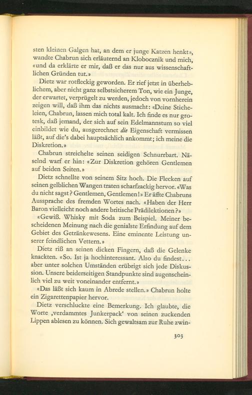 Dietz war rotfleckig geworden. Er rief jetzt in überheb- lichem, aber nicht ganz selbstsicherem Ton, wie ein Junge, der erwartet, verprũgelt zu werden, jedoch von vornherein zeigen will, daß ihm das nichts ausmacht: Deine Stiche- leien, Chabrun, lassen mich total kalt. Ich finde es nur gro- tesk, daß jemand, der sich auf sein Edelmannstum so viel einbildet wie du, ausgerechnet die Eigenschaft vermissen läßt, auf die's dabei hauptsãchlich ankommt; ich meine die Diskretion. v