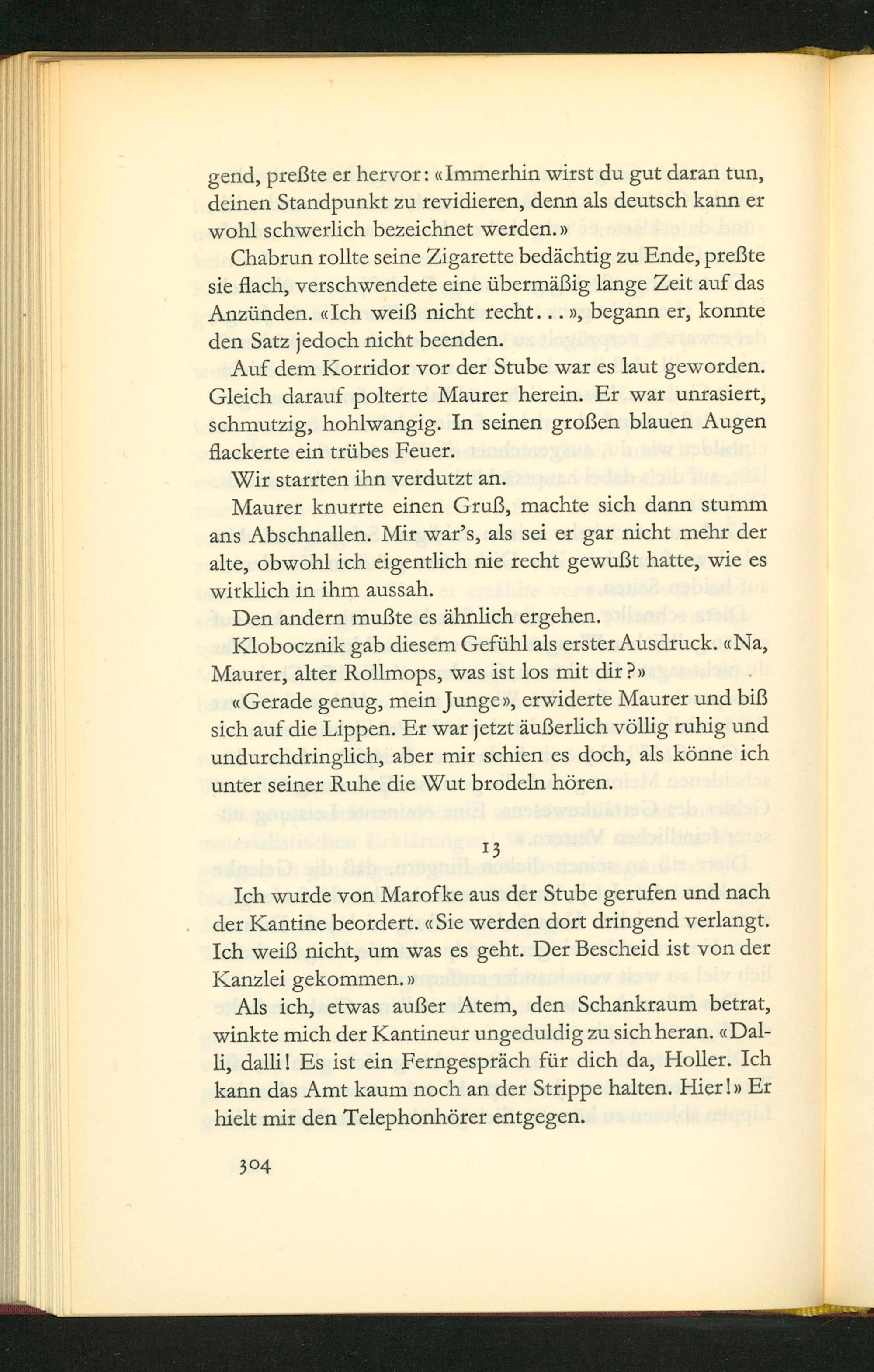 Auf᷑ dem Korridor vor der Stube war es laut geworden. Gleich darauf polterte Maurer herein. Er war unrasiert, schmutzig, hohlwangig. In seinen großen blauen Augen flackerte ein trũbes Feuer.