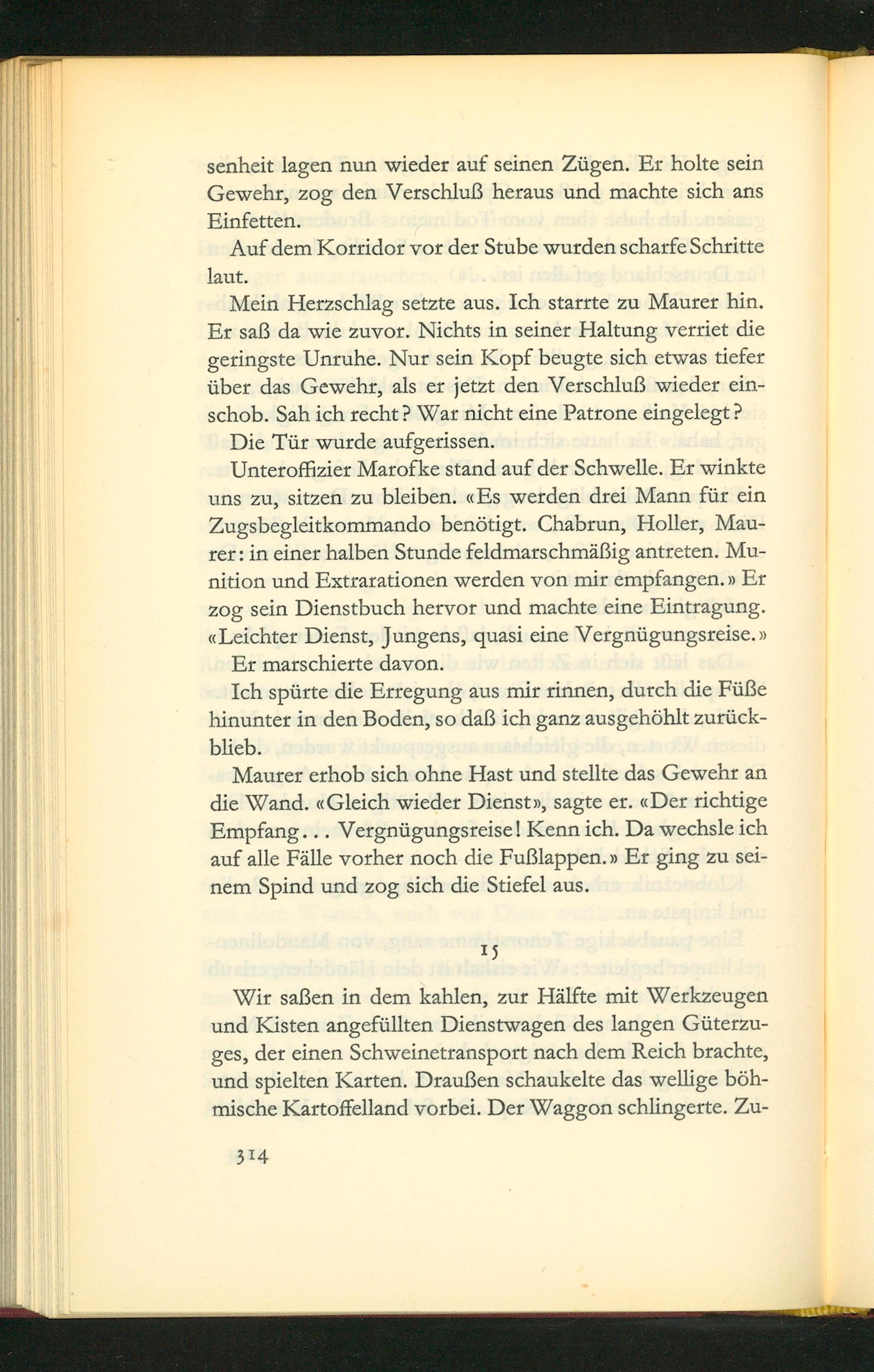Wir saßen in dem kahlen, zur Hälfte mit Werkzeugen und Kisten angefüllten Dienstwagen des langen Güterzu- ges, der einen Schweinetransport nach dem Reich brachte, und spielten Karten. Draußen schaukelte das wellige böh- mische Kartoffelland vorbei. Der Waggon schlingerte. Zu-