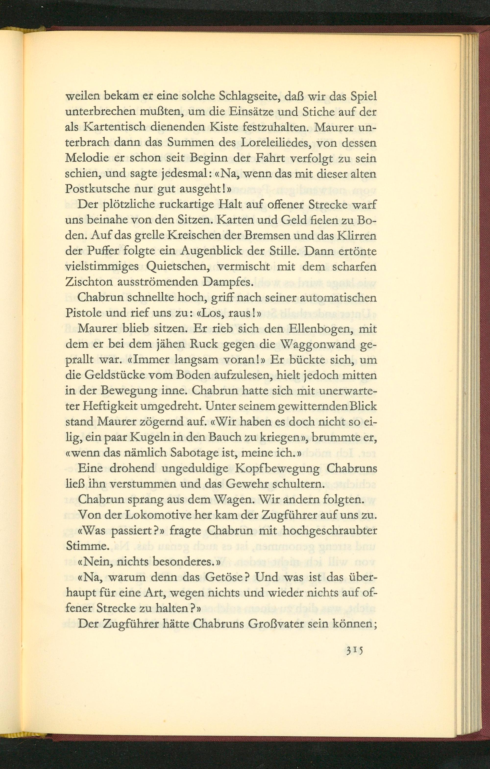 Maurer blieb sitzen. Er rieb sich den Ellenbogen, mit dem er bei dem jãhen Ruck gegen die Waggonwand ge- prallt war. aImmer langsam voran! Er bückte sich, um die Geldstũcke vom Boden aufzulesen, hielt jedoch mitten in der Bewegung inne. Chabrun hatte sich mit unerwarte- ter Heftigkeit umgedreht. Unter seinem gewitternden Blick stand Maurer zõgernd auf. Wir haben es doch nicht so ei- lig, ein paar Kugeln in den Bauch zu kriegenv, brummte er, wenn das nãmlich Sabotage ist, meine ich.v