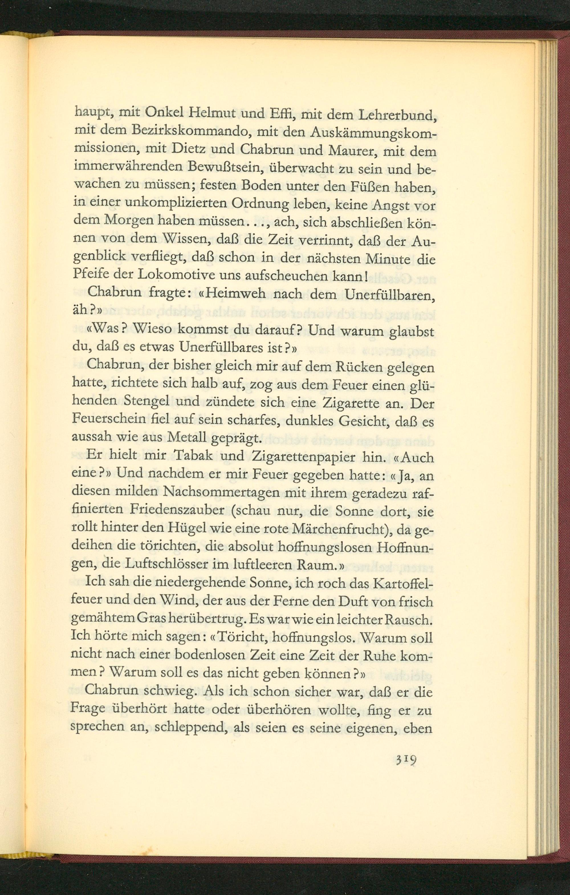 Ich Sah die niedergehende Sonne, ich roch das Kartoffel- feuer und den Wind, der aus der Ferne den Duft von frisch gemãhtem Gras herübertrug. Es war wie ein leichter Rausch. Ich hörte mich sagen:«Töricht, hoffnungslos. Warum soll nicht nach einer bodenlosen Zeit eine Zeit der Ruhe kom- men? Warum soll es das nicht geben kõnnen dv