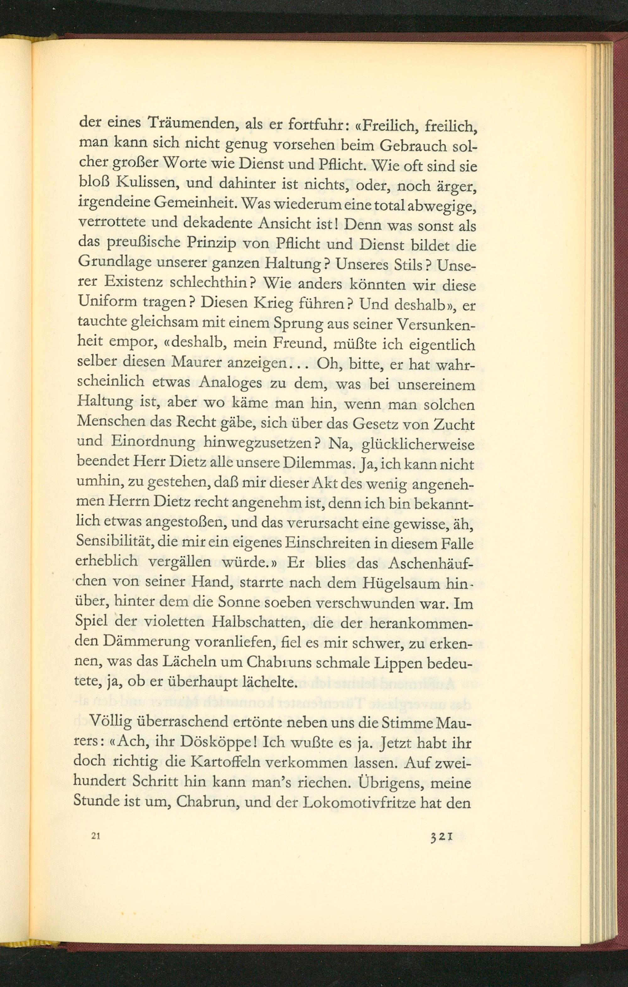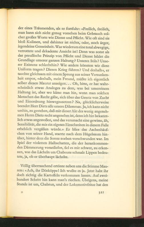 der eines Trãumenden, als er fortfuhr: Freilich, freilich, man kann sich nicht genug vorsehen beim Gebrauch sol- cher großer Worte wie Pienst und Pflicht. Wie oft sind sie blolß Kulissen, und dahinter ist nichts, oder, noch ärger, irgendeine Gemeinheit. Was wiederum eine total abwegige, verrottete und dekadente Ansicht ist! Denn was sonst als das preußische Prinzip von Pflicht und Pienst bildet die Grundlage unserer ganzen Haltung? Unseres Stils? Unse- rer Existenz schlechthin? Wie anders könnten wir diese Uniform tragen? Diesen Krieg führen? Und deshalbv, er tauchte gleichsam mit einem Sprung aus seiner Versunken- heit empor, adeshalb, mein Freund, müßte ich eigentlich selber diesen Maurer anzeigen... Oh, bitte, er hat wahr- Scheinlich etwas Analoges zu dem, was bei unsereinem Haltung ist, aber wo kãme man hin, wenn man solchen Menschen das Recht gãbe, sich über das Gesetz von Zucht und Einordnung hinwegzusetzen? Na, glücklicherweise beendet Herr Pietz alle unsere Dilemmas. Ja, ich kann nicht umhin, zu gestehen, daß mir dieser Akt des wenig angench- men Herrn Pietz recht angenehm ist, denn ich bin bekannt- lich etwas angestoßen, und das verursacht eine gewisse, äh, Sensibilitãt, die mir ein eigenes Einschreiten in diesem Falle erheblich vergällen würde. Er blies das Aschenhäuf- chen von seiner Hand, starrte nach dem Hügelsaum hin- über, hinter dem die Sonne soeben verschwunden war. Im Spiel der violetten Halbschatten, die der herankommen- den Dãmmerung voranliefen, fiel es mir schwer, zu erken- nen, was das Lãcheln um Chabiuns schmale Lippen pedeu- tete, ja, ob er überhaupt lächelte.
