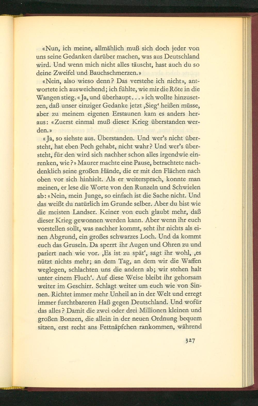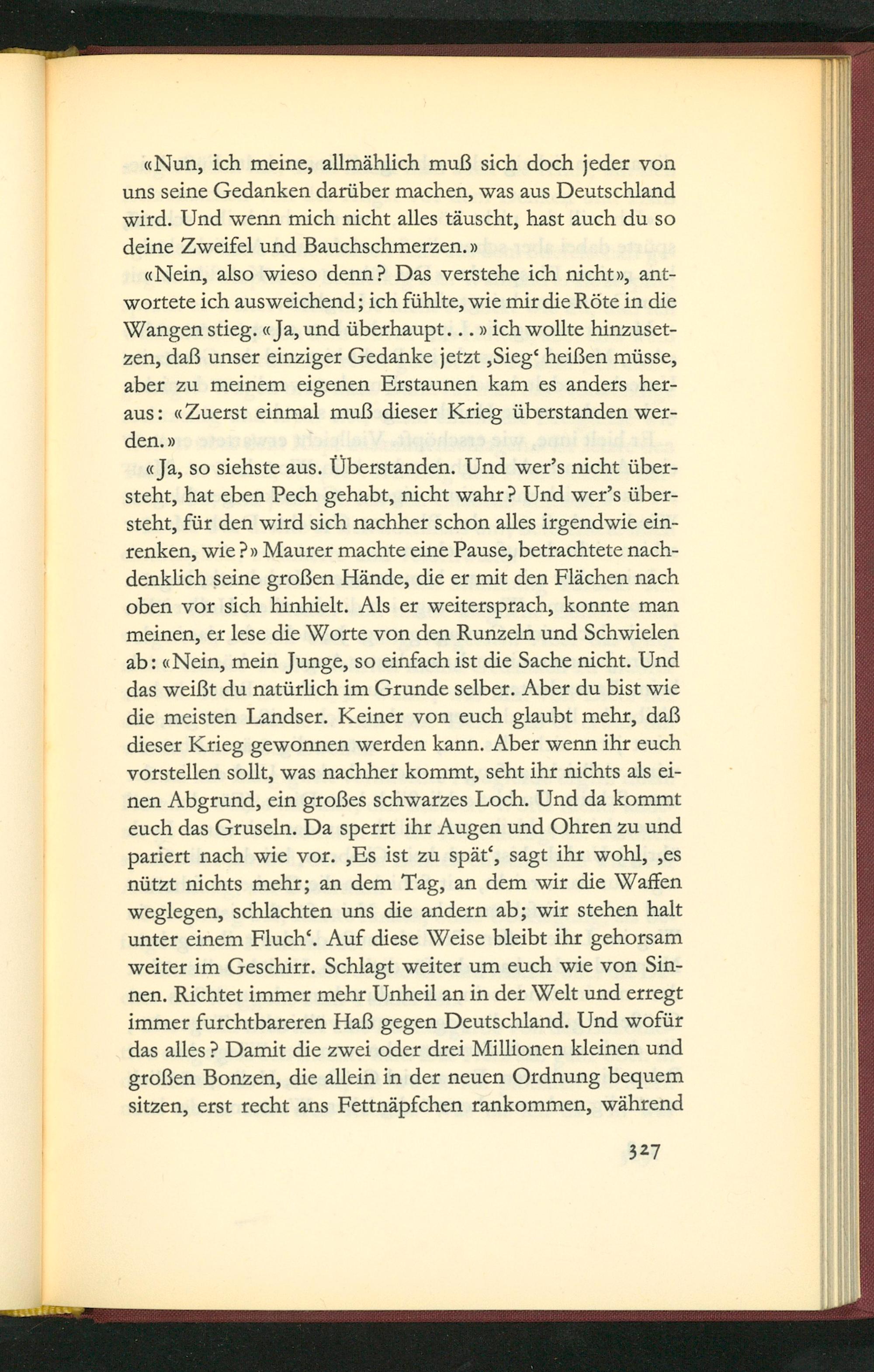 cJa, so sichste aus. Uberstanden. Und wer's nicht über- steht, hat eben Pech gehabt, nicht wahrd Und wer's über- steht, für den wird sich nachher schon alles irgendwie ein- renken, wie ꝰv Maurer machte eine Pause, betrachtete nach- denklich seine großen Hände, die er mit den Flãchen nach oben vor sich hinhielt. Als er weitersprach, konnte man meinen, er lese die Worte von den Runzeln und Schwielen ab: Nein, mein Junge, so einfach ist die Sache nicht. Und das weißt du natürlich im Grunde selber. Aber du bist wie die meisten Landser. Keiner von euch glaubt mehr, daß dieser Krieg gewonnen werden kann. Aber wenn ihr euch vorstellen sollt, was nachher kommt, seht ihr nichts als ei- nen Abgrund, ein großes schwarzes Loch. Und da kommt euch das Gruseln. Da sperrt ihr Augen und Ohren zu und pariert nach wie vor. Es ist zu spät', sagt ihr wohl, es nützt nichts mehr; an dem Tag, an dem wir die Waffen weglegen, schlachten uns die andern ab; wir stehen halt unter einem Fluch'. Auf diese Weise bleibt ihr gehorsam weiter im Geschirr. Schlagt weiter um euch wie von Sin- nen. Richtet immer mehr Unheil an in der Welt und erregt immer furchtbareren Haß gegen Deutschland . Und wofür das alles? Damit die ⁊wei oder drei Millionen kleinen und großen Bonzen, die allein in der neuen Ordnung bequem sitzen, erst recht ans Fettnãpfchen rankommen, wãhrend