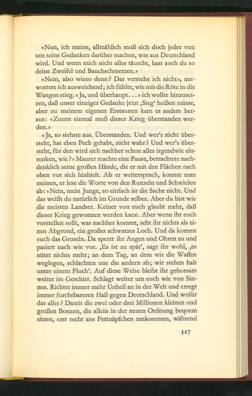 (Nein, also wieso denn? Das verstehe ich nicht», ant- wortete ich ausweichend; ich fühlte, wie mir die Rõte in die Wangen stieg.«Ja, und ũberhaupt.. vich wollte hinzuset- zen, daß unser einziger Gedanke jetzt,Sieg“ heißen müsse, aber zu meinem eigenen Erstaunen kam es anders her- aus:(Zuerst einmal muß dieser Krieg überstanden wer- den. v