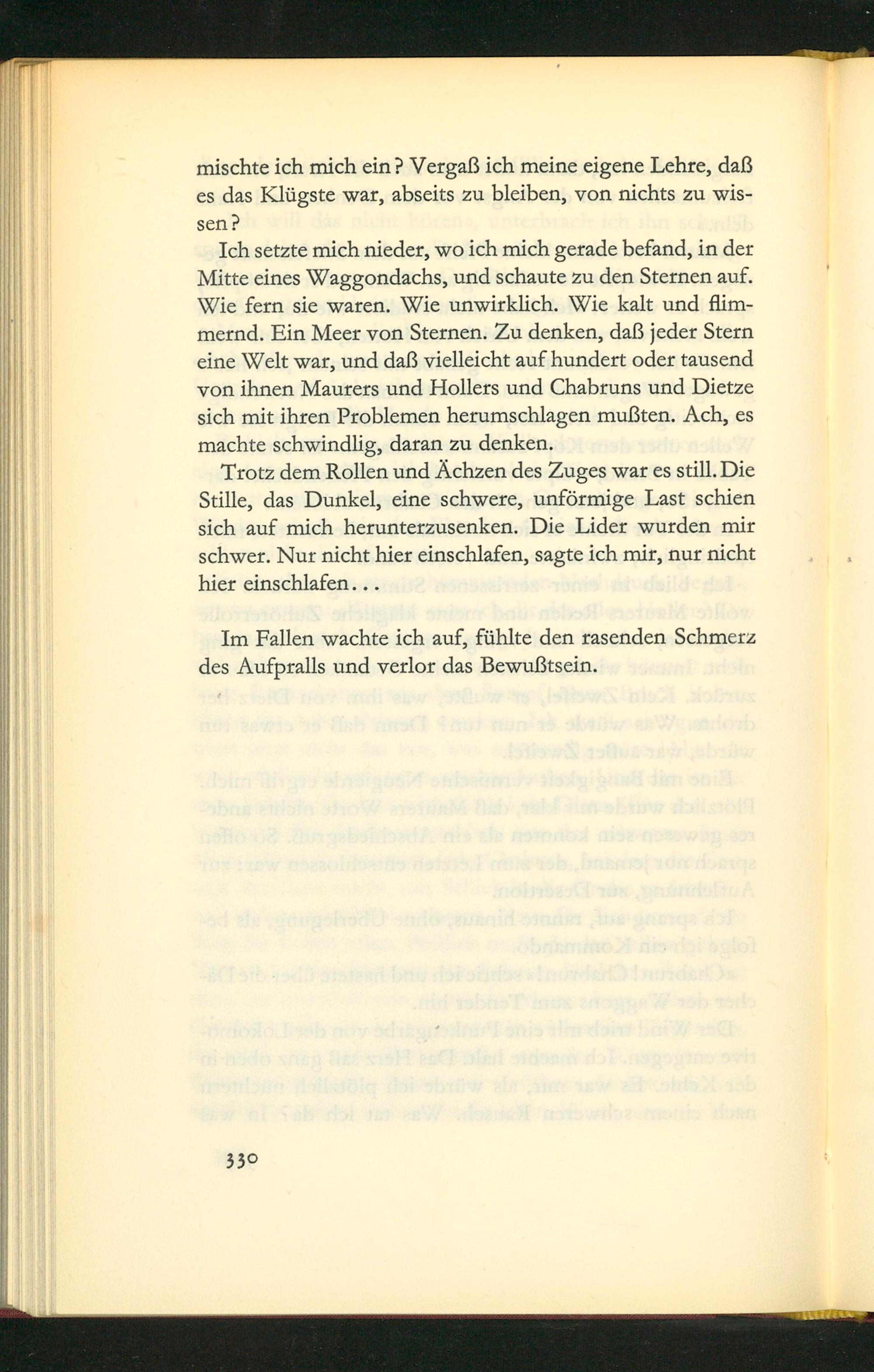 Trotz dem Rollen und Achzen des Zuges war es still. Die Stille, das Dunkel, eine schwere, unförmige Last schien sich auf mich herunterzusenken. Die Lider wurden mir schwer. Nur nicht hier einschlafen, sagte ich mir, nur nicht hier einschlafen...