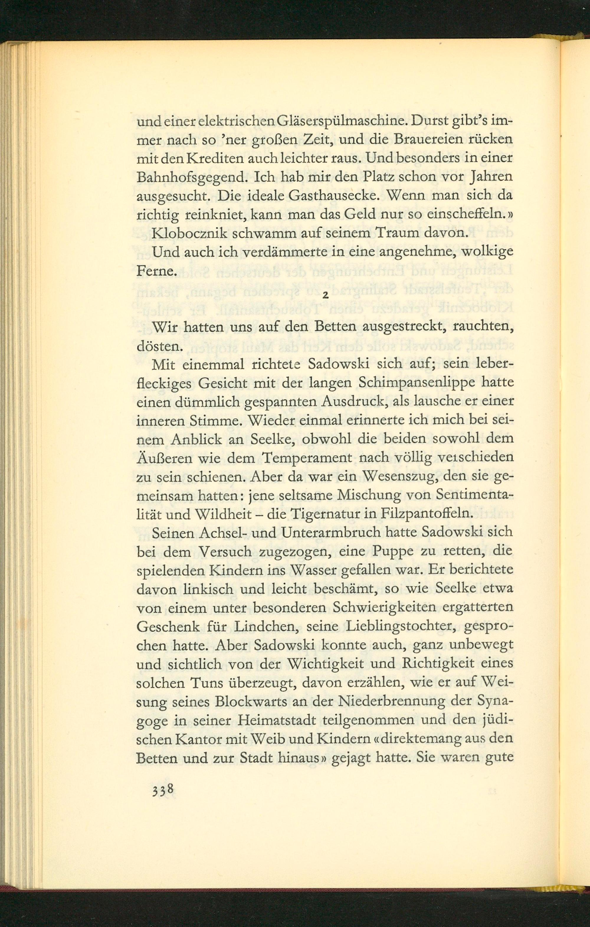 Seinen Achsel- und Unterarmbruch hatte Sadowski sich bei dem Versuch zugezogen, eine Puppe zu retten, die spielenden Kindern ins Wasser gefallen war. Er berichtete davon linkisch und leicht beschämt, so wie Seelke etwa von einem unter besonderen Schwierigkeiten ergatterten Geschenk für Lindchen, seine Lieblingstochter, gespro- chen hatte. Aber Sadowski konnte auch, ganz unbewegt und sichtlich von der Wichtigkeit und Richtigkeit eines solchen Tuns überzeugt, davon erzählen, wie er auf Wei- sung seines Blockwarts an der Niederbrennung der Syna- goge in seiner Heimatstadt teilgenommen und den jüdi- schen Kantor mit Weib und Kindern adirektemang aus den Betten und zur Stadt hinaus» gejagt hatte. Sie waren gute