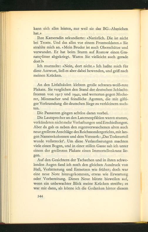 Auf den Gesichtern der Tschechen und in ihren schwe- lenden Augen fand ich noch den gleichen Ausdruck von Haß, Verbitterung und Entsetzen wie früher; doch war eine neue Note hinzugekommen, etwas wie Erwartung oder Vorbereitung. Dieses Neue blitzte bisweilen auf, wenn ein unbewachter Blick meine Krücken streifte; es war mir dann, als könne ich die Gedanken hinter diesem