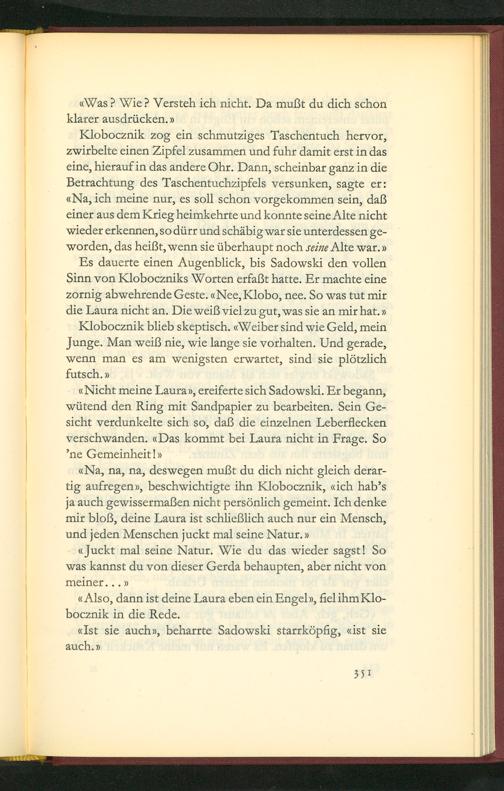 (Na, na, na, deswegen mußt du dich nicht gleich derar- tig aufregenv, beschwichtigte ihn Klobocznik, dich hab's ja auch gewissermaßen nicht persõnlich gemeint. Ich denke mir bloß, deine Laura ist schließlich auch nur ein Mensch, und jeden Menschen juckt mal seine Natur. v