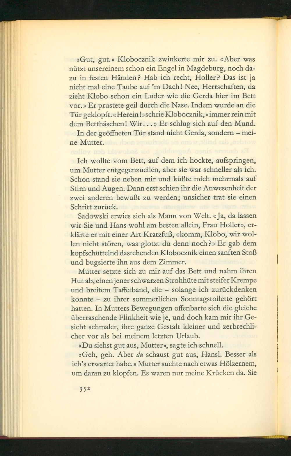 Mutter setzte sich zu mir auf das Bett und nahm ihren Hut ab, einen jener Schwarzen Strohhüte mit steifer Krempe und breitem Taffetband, die— solange ich zurũckdenken konnte— zu ihrer sommerlichen Sonntagstoilette gehört hatten. In Mutters Bewegungen offenbarte sich die gleiche ũberraschende Flinkheit wie je, und doch kam mir ihr Ge- sicht schmaler, ihre ganze Gestalt kleiner und zerbrechli- cher vor als bei meinem letzten Urlaub.