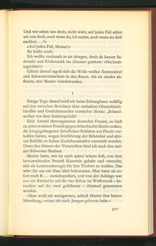 EHine Anzahl ehrvergessener deutscher Frauen, so hieß es, Seien in einem Prozeß gegen tschechische Hochverräter, die kriegsgefangenen feindlichen Soldaten zur Flucht ver- holfen hatten, wegen Irreführung der Behörden und akti- ver Beihilfe zu hohen Zuchthausstrafen verurteilt worden. Unter den Namen der Verurteilten fand ich auch den mei- ner Schwester Barbara.