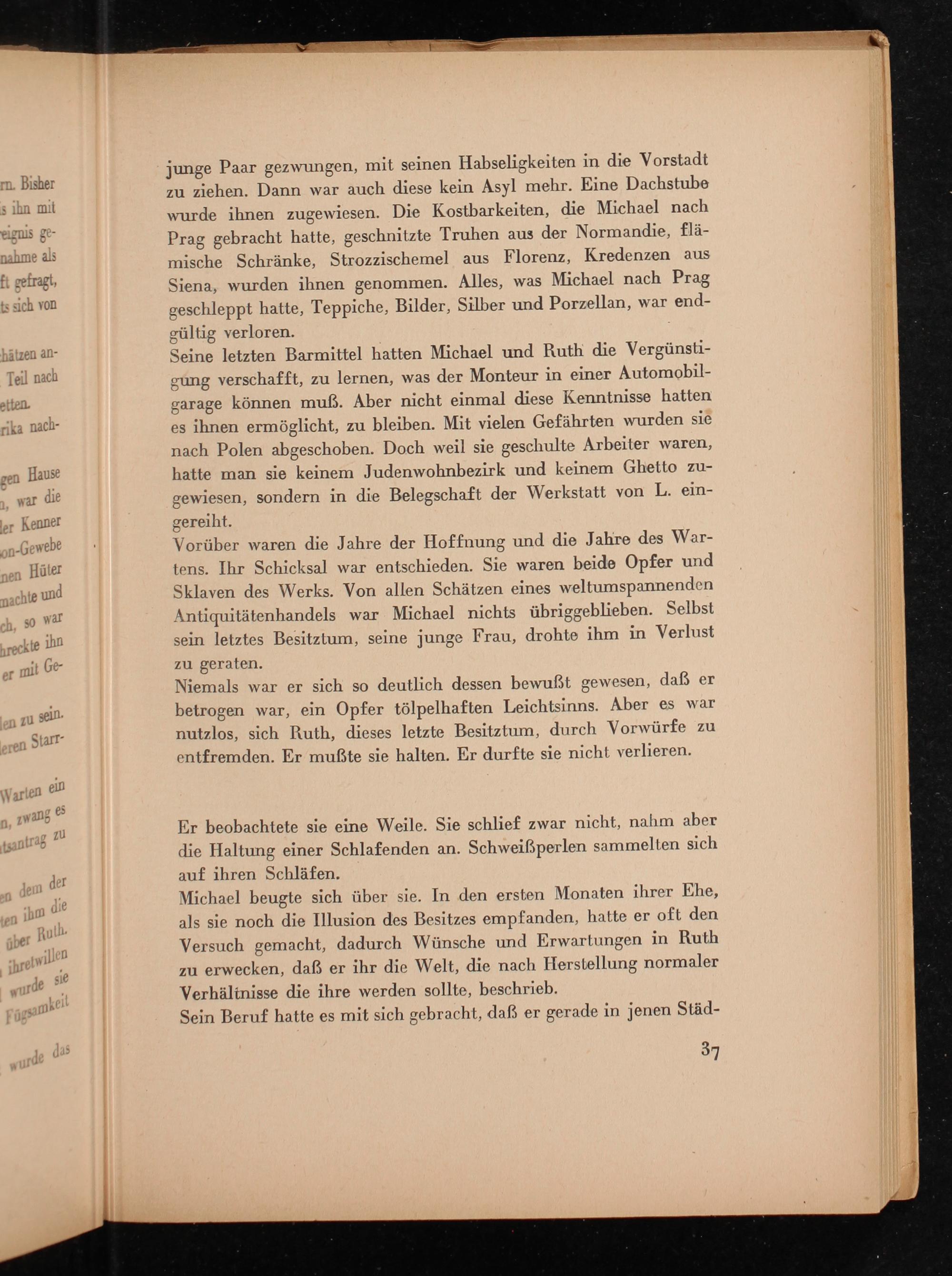 junge Paar gezwungen, mit seinen Habseligkeiten in die Vorstadt zu ziehen. Dann war auch diese kein Asyl mehr. Eine Dachstube wurde ihnen zugewiesen. Die Kostharkeiten, die Michael nach Prag gebracht hatte, geschnitzte Truhen aus der Normandie , flä- mische Schränke, Strozzischemel aus Florenz , Kredenzen aus Siena, wurden ihnen genommen. Alles, was Michael nach Prag geschleppt hatte, Teppiche, Bilder, Silber und Porzellan, war end- gültig verloren.