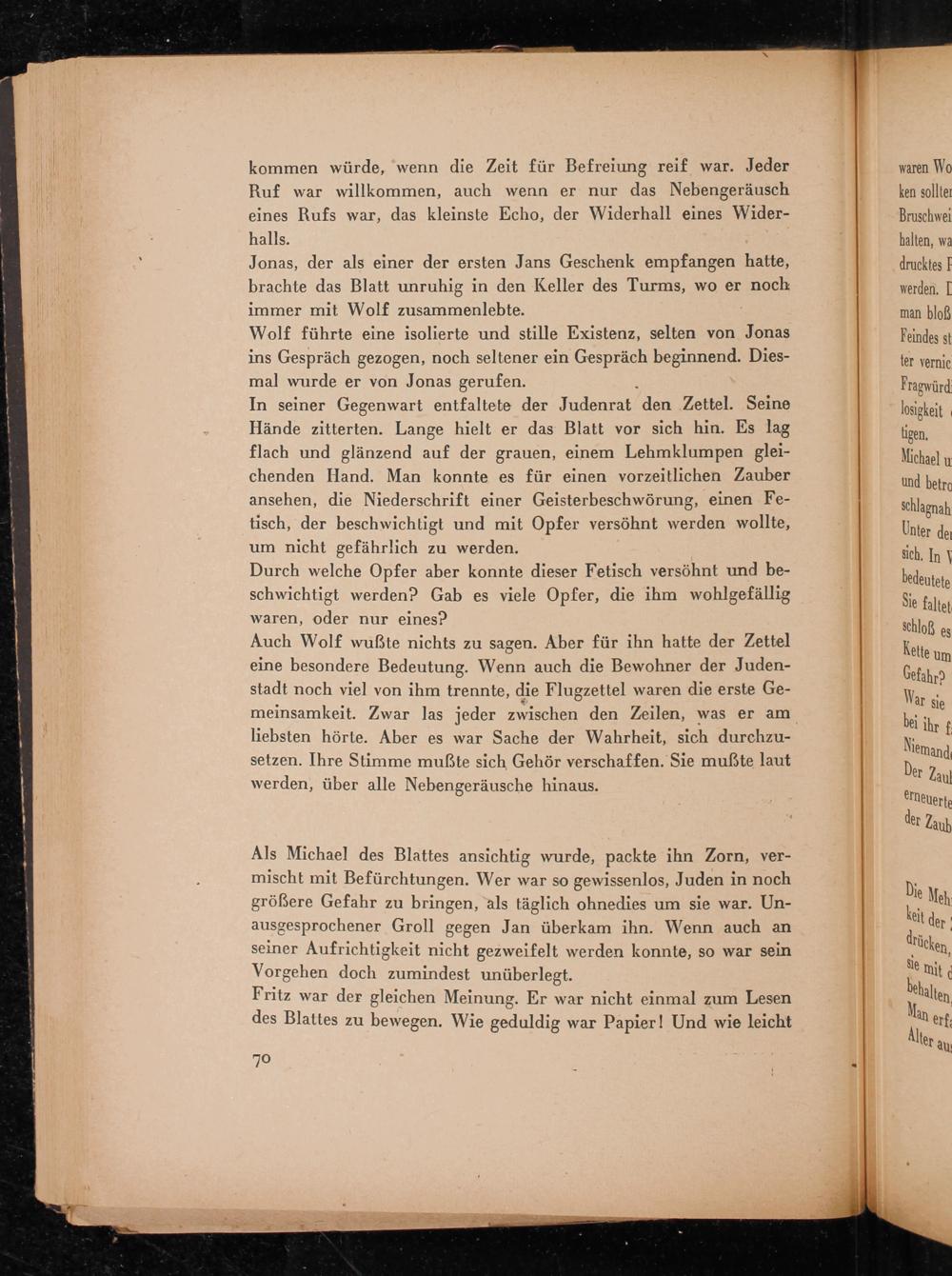 Als Michael des Blattes ansichtig wurde, packte ihn Zorn, ver- mischt mit Befürchtungen. Wer war so gewissenlos, Juden in noch größere Gefahr zu bPringen, als täglich ohnedies um sie war. Un- ausgesprochener Groll gegen Jan überkam ihn. Wenn auch an seiner Aufrichtigkeit nicht gezweifelt werden konnte, so war sein Vorgehen doch zumindest unüberlegt.