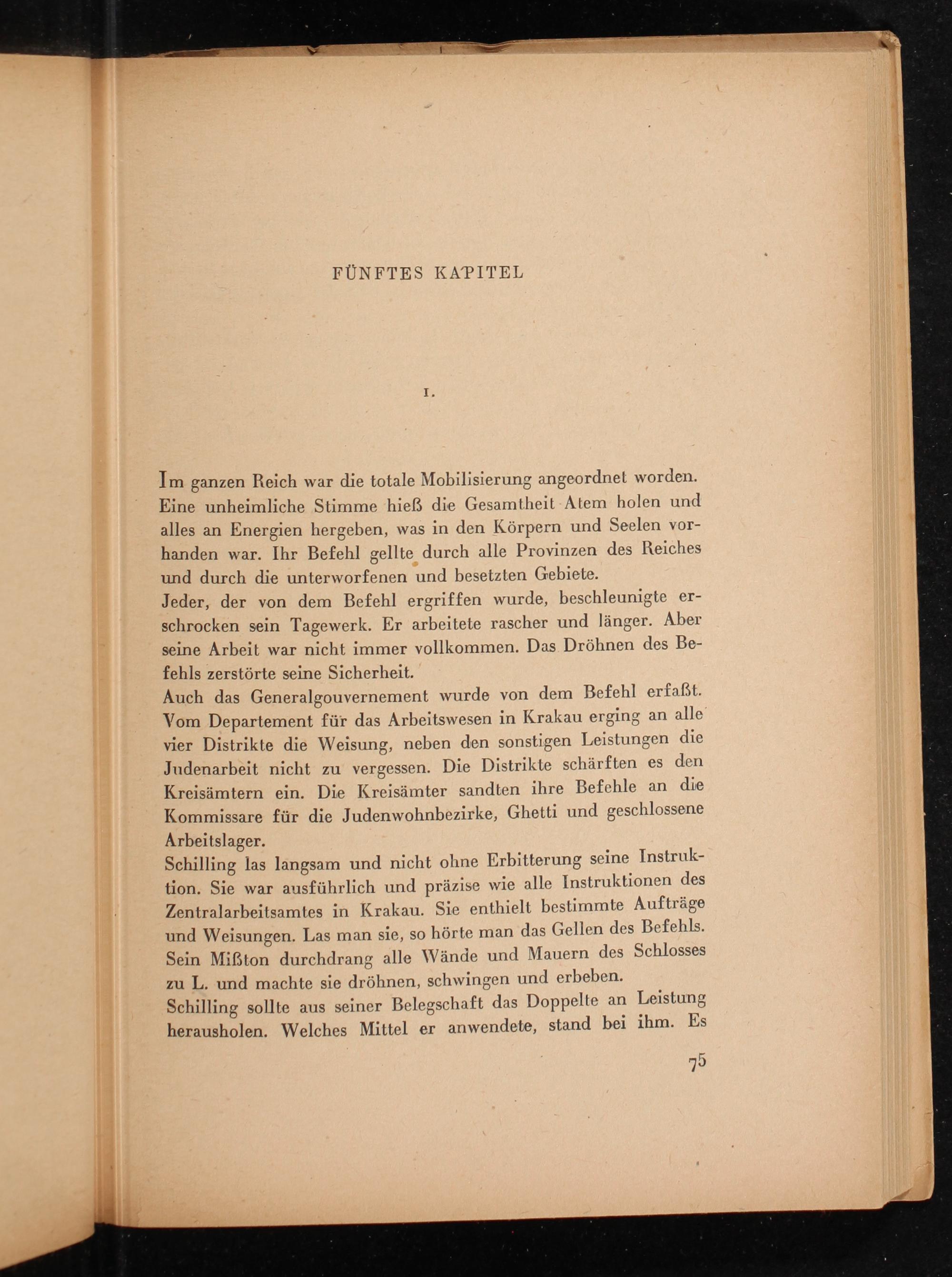 Schilling las langsam und nicht ohne Erbitterung seine Instruk- tion. Sie war ausführlich und präzise wie alle Instruktionen des Zentralarbeitsamtes in Krakau . Sie enthielt bestimmte Aufträge und Weisungen. Las man sie, so hörte man das Gellen des Befehls. Sein Mißton durchdrang alle Wände und Mauern des Schlosses zu L. und machte sie dröhnen, schwingen und erbeben.