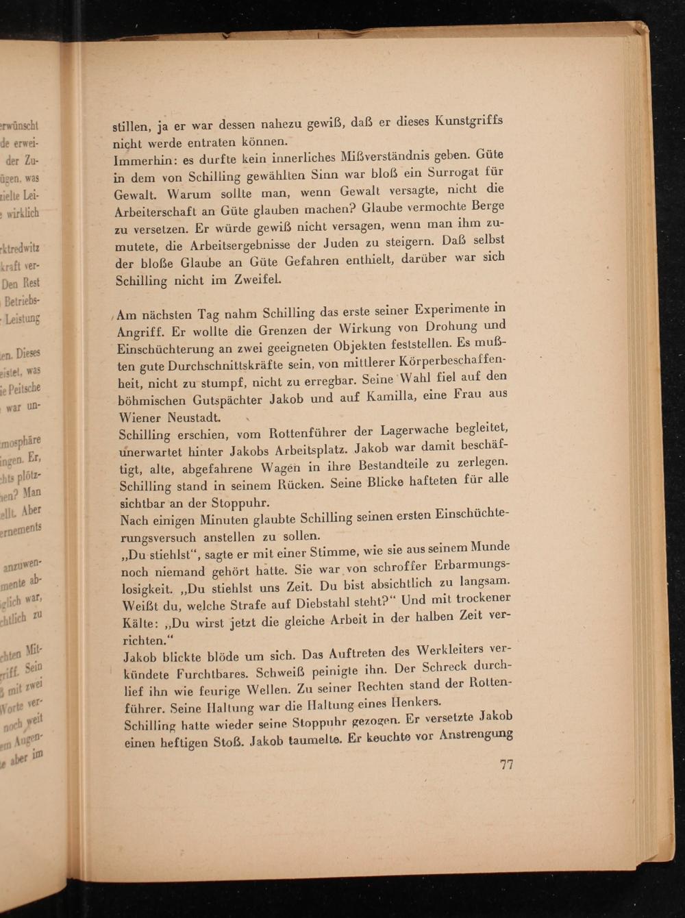 zu versetzen. Er würde gewiß nicht versagen, wenn man ihm zu- mutete, die Arbeitsergebnisse der Juden zu steigern. Daß selbst der bloße Glaube an Güte Gefahren enthielt, darüber war sich 3 Schilling nicht im Zweifel.