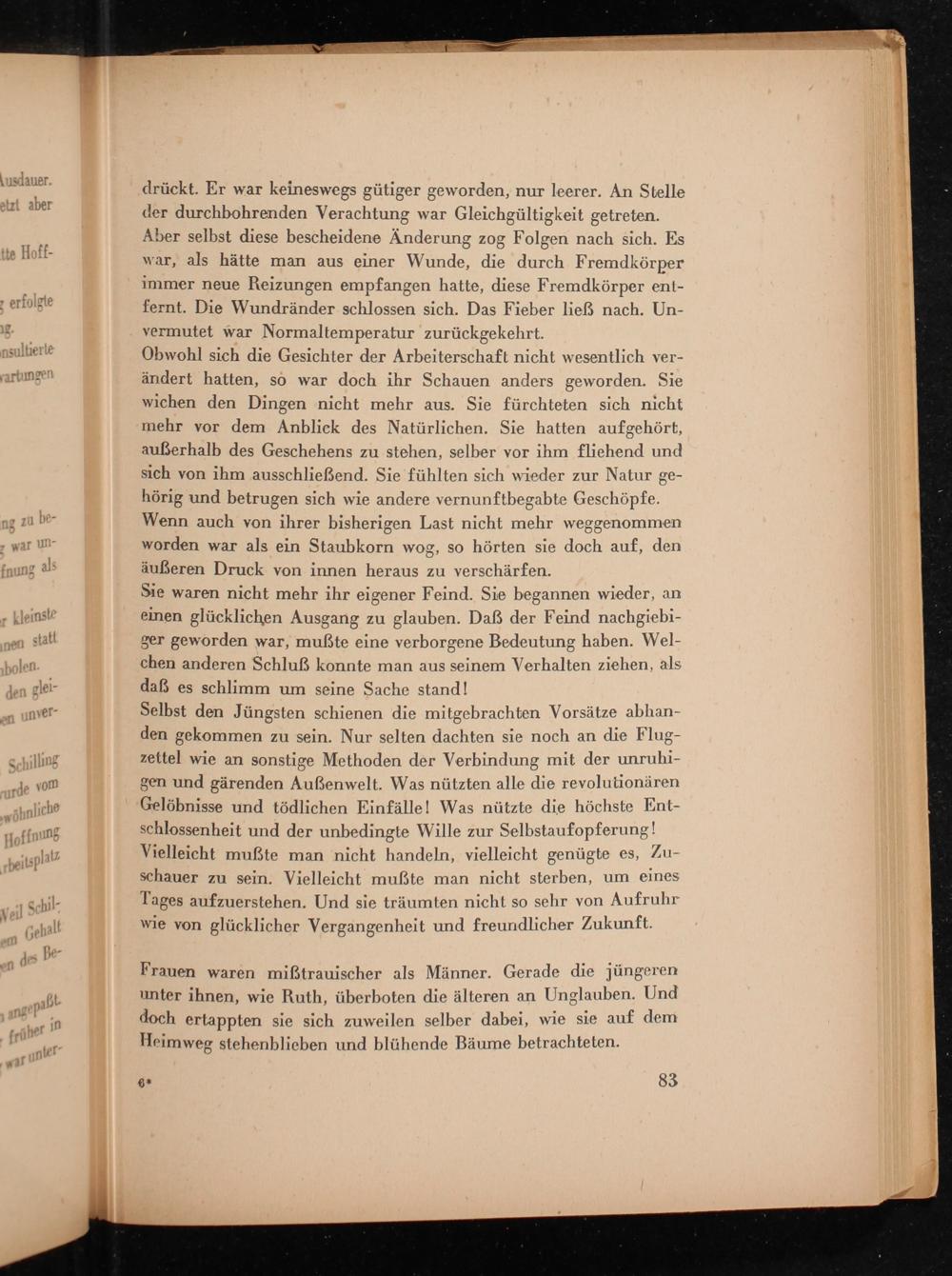 Obwohl sich die Gesichter der Arbeiterschaft nicht wesentlich ver- ändert hatten, so war doch ihr Schauen anders geworden. Sie wichen den Dingen nicht mehr aus. Sie fürchteten sich nicht mehr vor dem Anblick des Natürlichen. Sie hatten aufgehört, außerhalb des Geschehens zu stehen, selber vor ihm fliehend und sich von ihm ausschlieſßßend. Sie fühlten sich wieder zur Natur ge- hörig und betrugen sich wie andere vernunftbegabte Geschöpfe. Wenn auch von ihrer pisherigen Last nicht mehr weggenommen worden war als ein Staubkorn wog, so hörten sie doch auf, den äußeren Druck von innen heraus zu verschärfen.