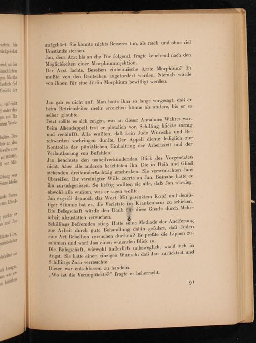 Jan ergriff dennoch das Wort. Mit gesenktem Kopf und demũ- tiger Stimme bat er, die Verletzte ins Krankenhaus zu schicken. Die Belegschaft würde den Dank für diese Gnade durch Mehr- arbeit abzustatten versuchen. 5