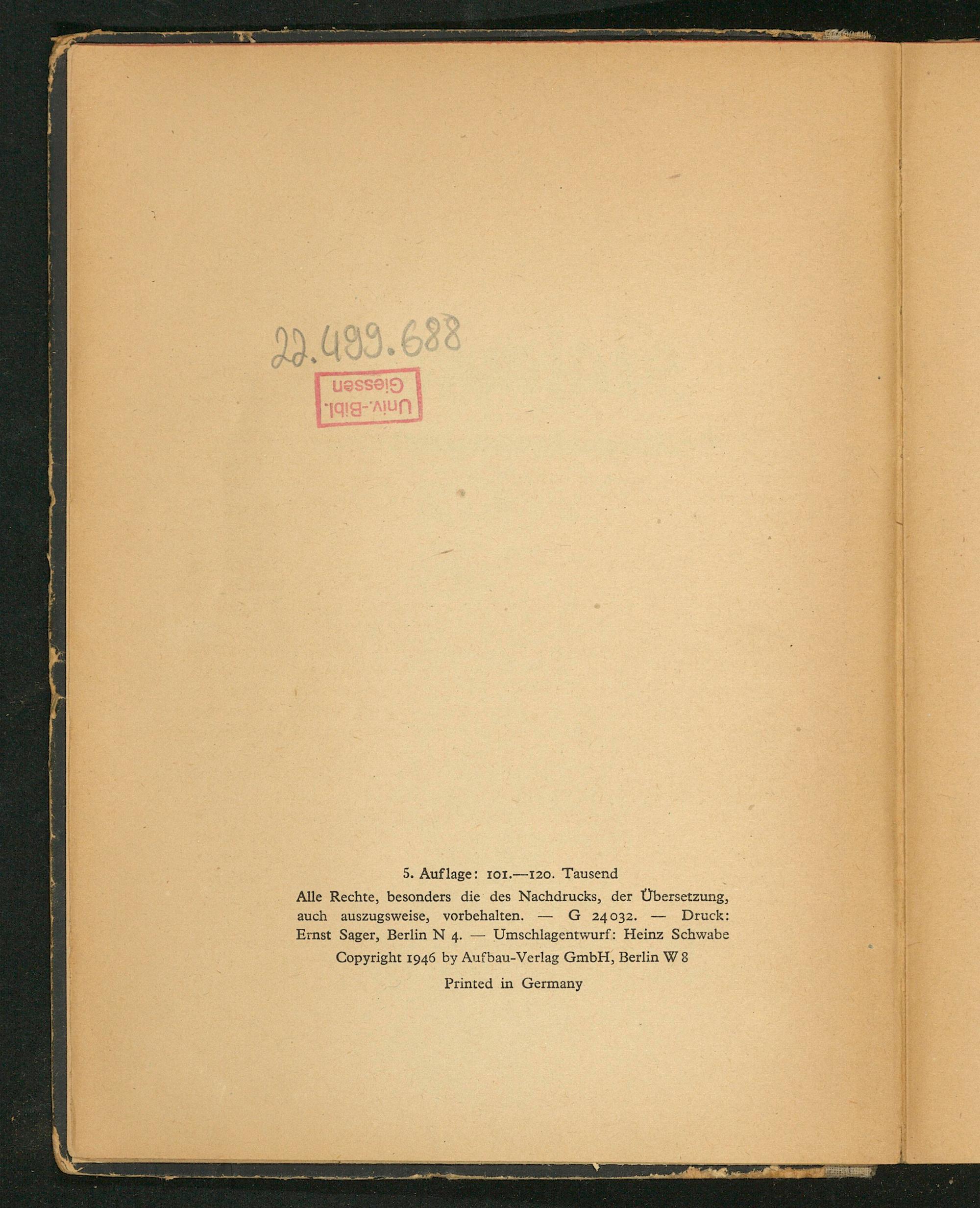 ————— c ciehR 5. Auf lage: 107.— 120. Tausend Alle Rechte, besonders die des Nachdrucks, der versetzung, auch auszugsweise, vorbehalten.— 6 24 032.— Druck: Ernst Sager, Berlin M 4.— Umschlagentwurf: Heinz Schwabe Copyright 1946 by Aufbau-Verlag GmbH, Berlin W8 Printed in Germany