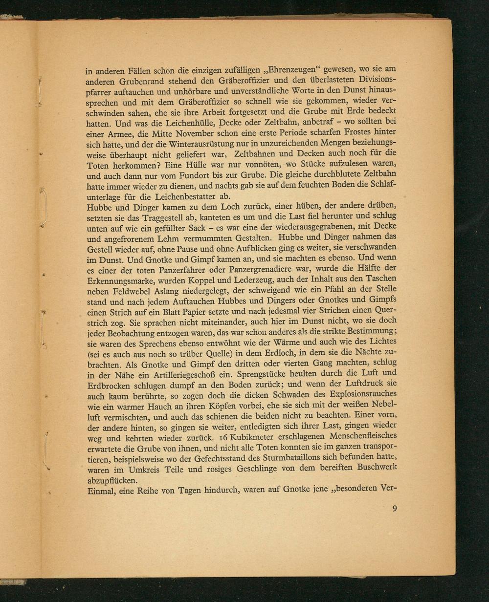 Hubbe und Dinger kamen zu dem Loch zurück, einer hüben, der andere drüben, Setzten sie das Traggestell ab, kanteten es um und die Last fiel herunter und Schlug unten auf wie ein gefüllter Sack— es war eine der wiederausgegrabenen, mit Decke und angefrorenem Lehm vermummten Gestalten. Hubbe und Dinger nahmen das Gestell wieder auf, ohne Pause und ohne Aufblicken ging es weiter, sie verschwanden im Dunst. Und Gnotke und Gimpf kamen an, und sie machten es ebenso. Und wenn es einer der toten Panzerfahrer oder Panzergrenadiere war, wurde die Hälfte der Erkennungsmarke, wurden Koppel und Lederzeug, auch der Inhalt aus den Taschen neben Feldwebel Aslang niedergelegt, der schweigend wie ein Pfahl an der Stelle stand und nach jedem Auftauchen Hubbes und Dingers oder Gnotkes und Gimpfs einen Strich auf ein Blatt Papier setzte und nach jedesmal vier Strichen einen Quer- strich zog. Sie sprachen nicht miteinander, auch hier im Dunst nicht, wo sie doch jeder Beobachtung entzogen waren, das war schon anderes als die strikte Bestimmung; sie waren des Sprechens ebenso entwöhnt wie der Wärme und auch wie des Lichtes (Sei es auch aus noch so trüber Quelle) in dem Erdloch, in dem sie die Nãchte zu- brachten. Als Gnotke und Gimpf den dritten oder vierten Gang machten, schlug in der Nähe ein Artilleriegeschoß ein. Sprengstücke heulten durch die Luft und Prdbrocken schlugen dumpf an den Boden zurück; und wenn der Luftdruck sie auch kaum berührte, so zogen doch die dicken Schwaden des Explosionsrauches wie ein warmer Hauch an ihren Köpfen vorbei, ehe sie sich mit der weißen Mebel- luft vermischten, und auch das schienen die beiden nicht zu beachten. Einer vorn, der andere hinten, so gingen sie weiter, entledigten sich ihrer Last, gingen wieder weg und kehrten wieder zurück. 16 Kubikmeter erschlagenen Menschenfleisches erwartete die Grube von ihnen, und nicht alle Toten konnten sie im ganzen transpor- tieren, beispielsweise wo der Gefechtsstand des Sturmbataillons sich befunden hatte, waren im Umkreis Teile und rosiges Geschlinge von dem bereiften Buschwerk abzupflũcken.
