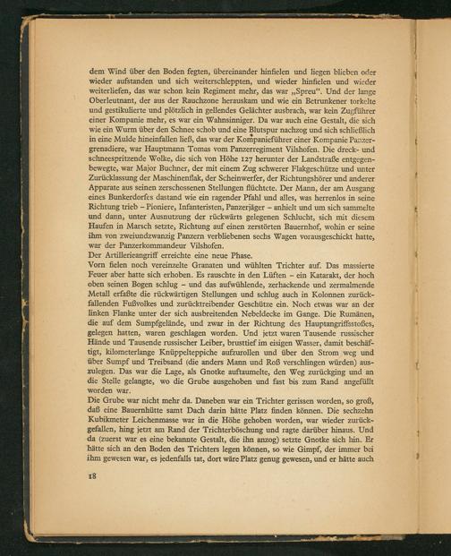 dem Wind über den Boden fegten, übereinander hinfielen und liegen blicben oder wieder aufstanden und sich weiterschleppten, und wieder hinfielen und wieder weiterliefen, das war schon kein Regiment mehr, das war„Spreu“. Und der lange Oberleutnant, der aus der Rauchzone herauskam und wie ein Betrunkener torkelte und gestikulierte und plõtzlich in gellendes Gelächter ausbrach, war kein Zugführer einer Kompanie mehr, es war ein Wahnsinniger. Da war auch eine Gestalt, die sich wie ein Wurm über den Schnee schob und eine Blutspur nachzog und sich schließlich in eine Mulde hineinfallen ließ, das war der Kormpaniefũhrer einer Kompanie Panzer- grenadiere, war Hauptmann Tomas vom Panzerregiment Vilshofen. Die dreck- und schmeespritzende Wolke, die sich von Höhe 127 herunter der Landstraße entgegen-