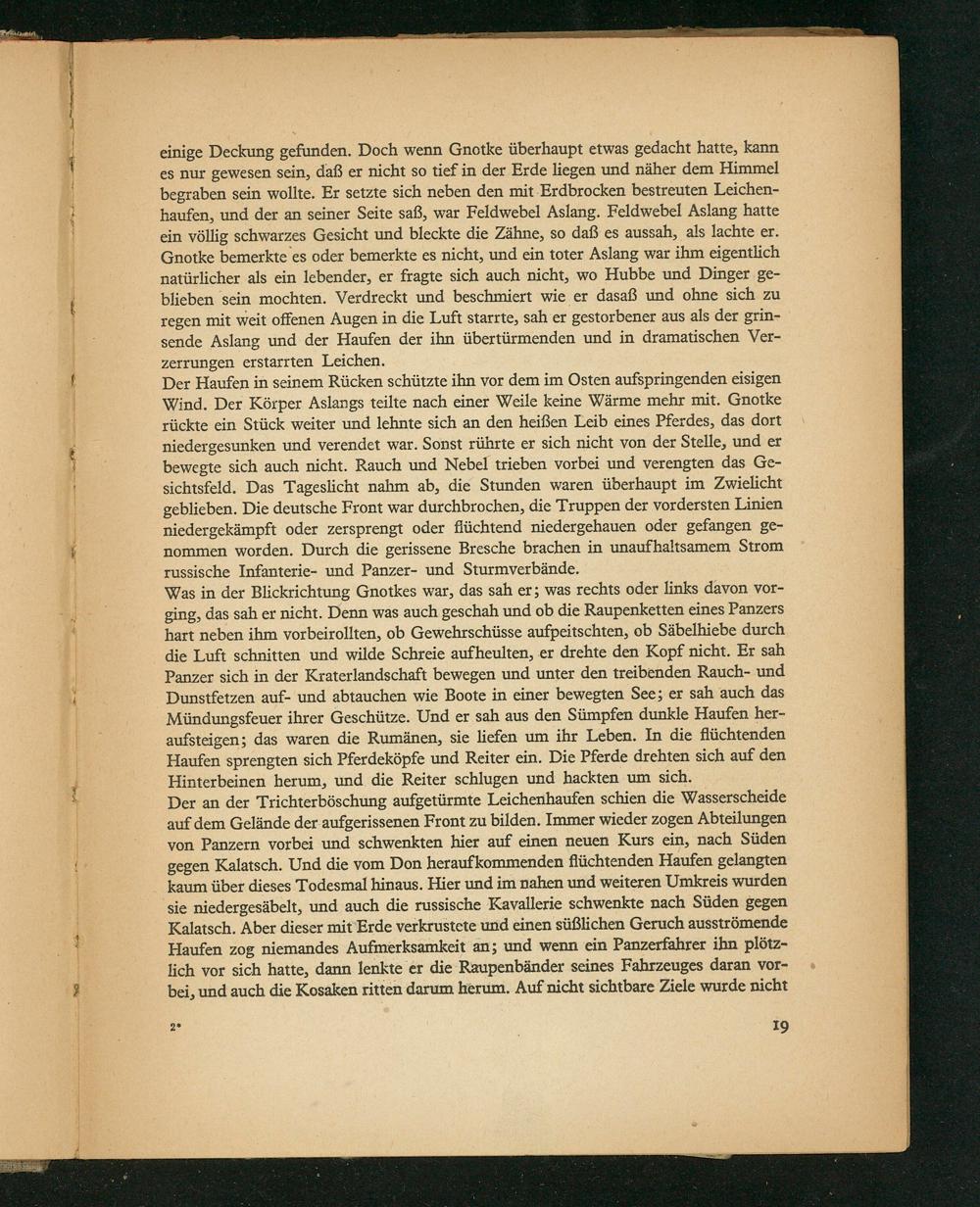 Der Haufen in seinem Rücken schützte ihn vor dem im Osten aufspringenden eisigen Wind. Der Körper Aslangs teilte nach einer Weile keine Wärme mehr mit. Gnotke rückte ein Stũck weiter und lehnte sich an den heißen Leib eines Pferdes, das dort niedergesunken und verendet war. Sonst rührte er sich nicht von der Stelle, und er bewegte sich auch nicht. Rauch und Nebel trieben vorbei und verengten das Ge- sichtsfeld. Das Tageslicht nahm ab, die Stunden waren überhaupt im Zwielicht geblieben. Die deutsche Front war durchbrochen, die Truppen der vordersten Linien niedergekämpft oder zersprengt oder füchtend niedergehauen oder gefangen ge- nommen worden. Durch die gerissene Bresche brachen in unaufhaltsamem Strom russische Infanterie- und Panzer- und Sturmverbände.