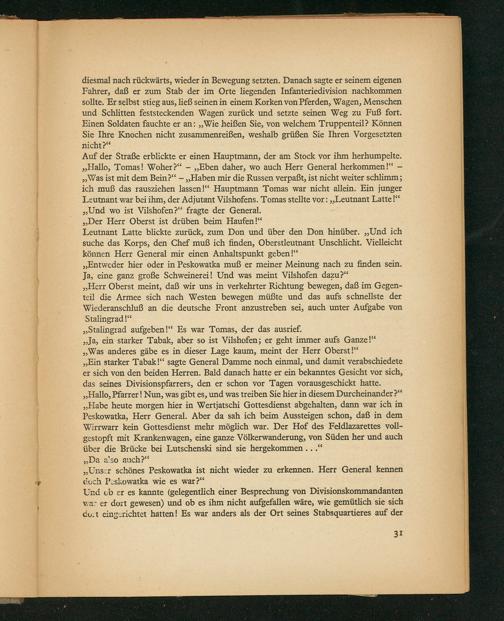 Auf der Straße erblickte er einen Hauptmann, der am Stock vor ihm herhumpeite. „Hallo, Tomas! Woher?“—„Eben daher, wo auch Herr General herkommen!“— „Was ist mit dem Bein?“—„Haben mir die Russen verpaßt, ist nicht weiter schlimm; ich muß das rauszichen lassen!“ Hauptmann Tomas war nicht allein. Ein junger Leutnant war bei ihm, der Adjutant Vilshofens. Tomas stellte vor:„Leutnant Latte!“ „Und wo ist Vilshofen?“ fragte der General.