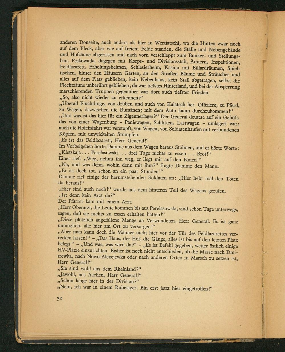 anderen Ponseite, auch anders als hier in Wertjatschi, wo die Hütten zwar noch auf dem Fleck, aber wie auf freiem Felde standen, die Ställe und Nebengebãude und Hofzäune abgerissen und nach vorn verschleppt zum Bunker- und Stellungs- bau. Peskowatka dagegen mit Korps- und Divisionsstab, Kmtern, Inspektionen, Feldlazarett, Erholungsheimen, Schlesierheim, Kasino mit Billardrãumen, Spiel- tischen, hinter den Häusern Gärten, an den Straßen Bäume und Sträucher und alles auf dem Platz geblieben, kein Mebenhaus, kein Stall abgetragen, selbst die Flechtzäune unberührt geblieben; da war tiefstes Hinterland, und bei der Absperrung marschierenden Truppen gegenüber war dort auch tiefster Frieden.