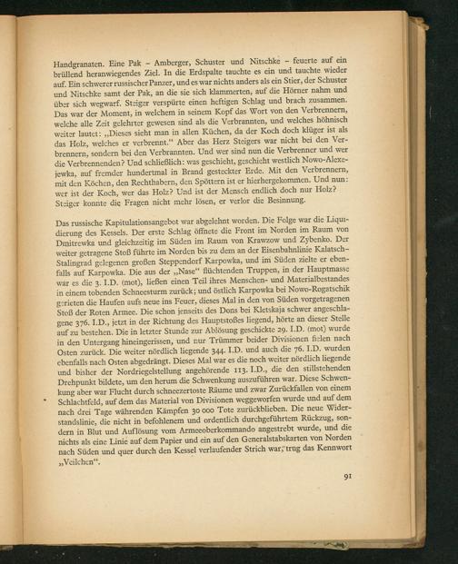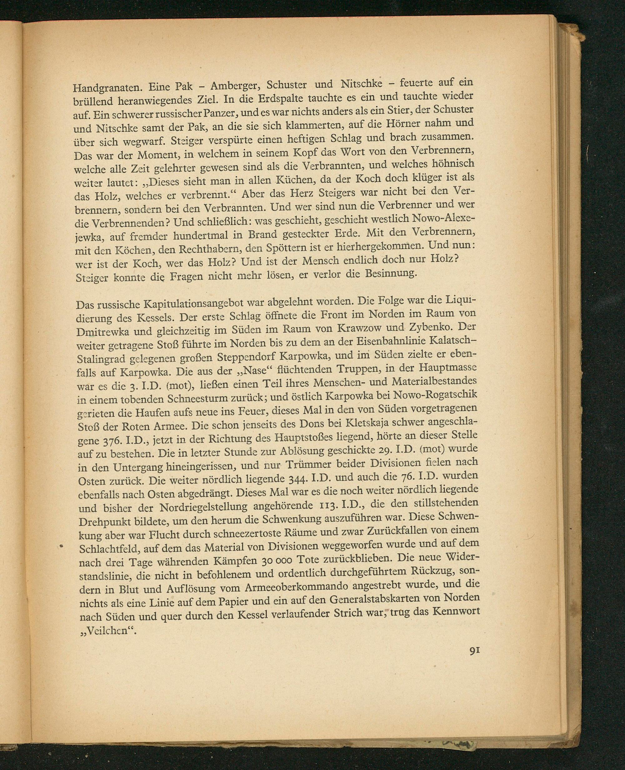 Handgranaten. Fine Pak— Amberger, Schuster und Nitschke— feuerte auf ein prüllend heranwiegendes Ziel. In die Erdspalte tauchte es ein und tauchte wieder auf Pin schwerer russischer Panzer, und es war nichts anders als ein Stier, der Schuster und Nitschke samt der Pak, an die sie sich klammerten, auf die Hörner nahm und über sich wegwarf. Steiger verspürte einen heftigen Schlag und brach zusammen. Das war der Moment, in welchem in seinem Kopf das Wort von den Verbrennern, welche alle Zeit gelchrter gewesen sind als die Verbrannten, und welches höhnisch weiter lautet:„Dieses sieht man in allen Küchen, da der Koch doch klüger ist als das Holz, welches er verbrenmt.“ Aber das Herz Steigers war nicht bei den Ver- brennern, Sondern bei den Verbrannten. Und wer sind nun die Verbrenner und wer die Verbrennenden? Und schließlich: was geschicht, geschicht westlich Nowo-Alexe- jewka, auf fremder hundertmal in Brand gesteckter Erde. Mit den Verbrennern, mit den Köchen, den Rechthabern, den Spöttern ist er hierhergekommen. Und nun: wer ist der Koch, wer das Holz? Und ist der Mensch endlich doch nur Holz? Steiger konnte die Fragen nicht mehr lösen, er verlor die Besinnung.