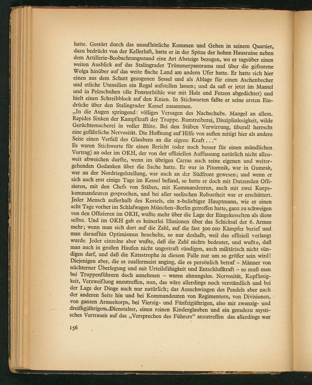 hatte. Gestört durch das unaufhörliche Kommen und Gehen in seinem Quartier, dazu bedrückt von der Kellerluft, hatte er in der Spitze der hohen Hausruine neben dem Artillerie-Beobachtungsstand eine Art Absteige bezogen, wo er tagsüber einen weiten Ausblick auf das Stalingrader Trümmerpanorama und über die gefrorene Wolga hinüber auf das weite flache Land am andern Uffer hatte. Er hatte sich hier einen aus dem Schutt gezogenen Sessel und als Ablage für einen Aschenbecher und etliche Utensilien ein Regal aufstellen lassen; und da saß er jetzt im Mantel und in Pelzschuhen(die Fensterhöhle war mit Holz und Fetzen abgedichtet) und hielt einen Schreibblock auf den Knien. In Stichworten faßte er seine ersten Fin- drücke über den Stalingrader Kessel zusammen.