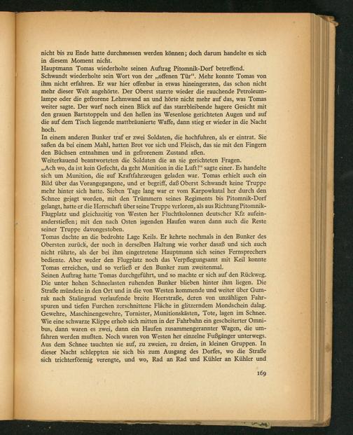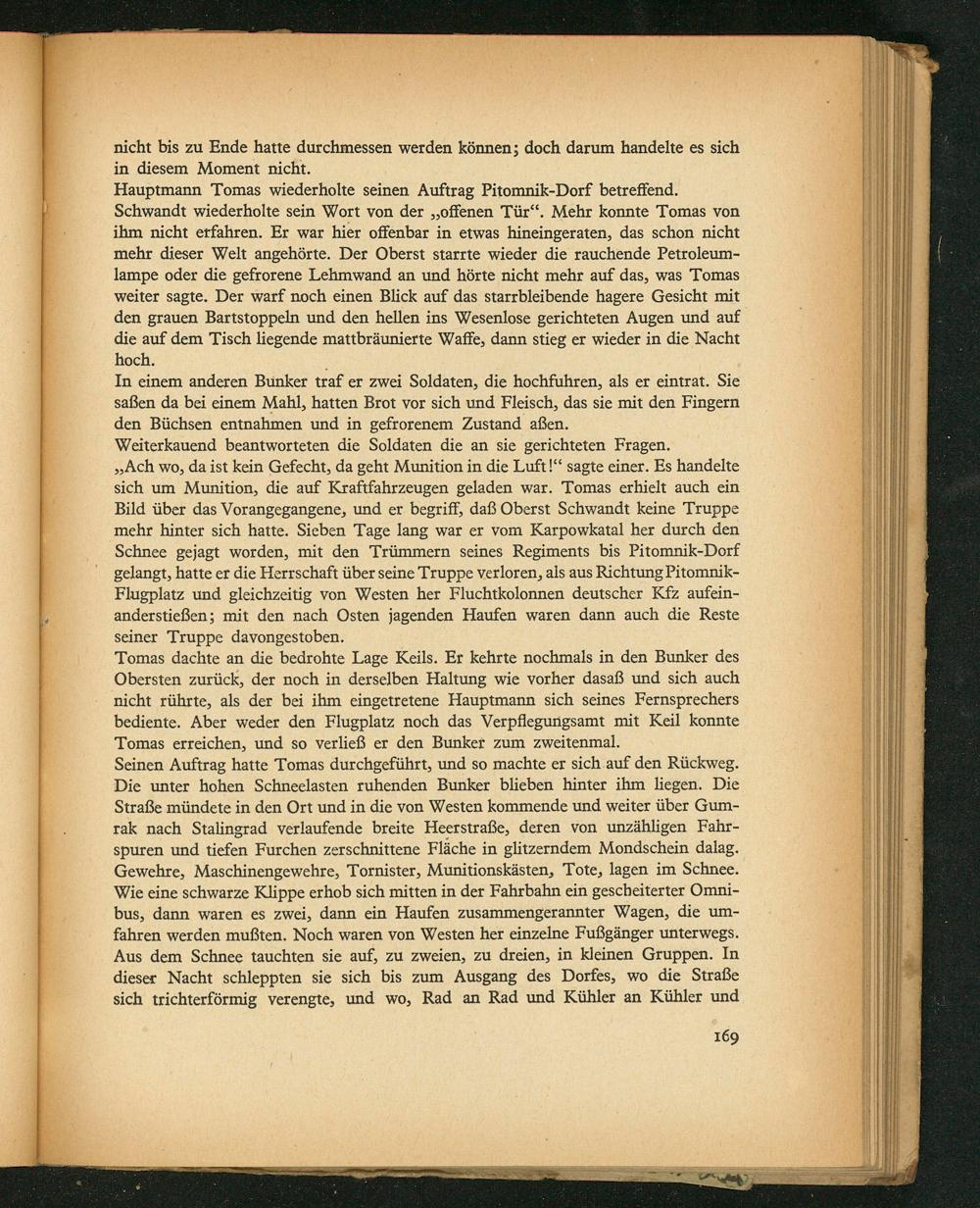 Seinen Auftrag hatte Tomas durchgeführt, und so machte er sich auf den Rückweg. Die unter hohen Schneelasten ruhenden Bunker blieben hinter ihm liegen. Die Straße mündete in den Ort und in die von Westen kommende und weiter über Gum- rak nach Stalingrad verlaufende breite Heerstraße, deren von unzähligen Fahr- spuren und tiefen Furchen zerschnittene Fläche in glitzerndem Mondschein dalag. Gewehre, Maschinengewehre, Tornister, Munitionskästen, Tote, lagen im Schnee. Wie eine schwarze Klippe erhob sich mitten in der Fahrbahn ein gescheiterter Omni- bus, dann waren es zwei, dann ein Haufen zusammengerannter Wagen, die um- fahren werden mußten. Noch waren von Westen her einzelne Fußgänger unterwegs. Aus dem Schnee tauchten sie auf, zu zweien, zu dreien, in Kleinen Gruppen. In dieser Macht schleppten sie sich bis zum Ausgang des Dorfes, wo die Straße sich trichterförmig verengte, und wo, Rad an Rad und Kühler an Kühler und