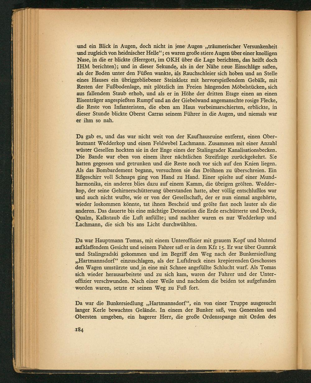 Da gab es, und das war nicht weit von der Kaufhausruine entfernt, einen Ober- leutnant Wedderkop und einen Feldwebel Lachmann. Zusammen mit einer Anzahl wüster Gesellen hockten sie in der Enge eines der Stalingrader Kanalisationsbecken. Die Bande war eben von einem ihrer nächtlichen Streifzüge zurückgekehrt. Sie hatten gegessen und getrunken und die Reste noch vor sich auf den Knien liegen. Als das Bombardement begann, versuchten sie das Dröhnen zu überschreien. Ein Eßgeschirr voll Schnaps ging von Hand zu Hand. Finer spielte auf einer Mund- harmonika, ein anderer blies dazu auf einem Kamm, die übrigen grölten. Wedder- kop, der seine Gehirnerschütterung überstanden hatte, aber völlig entschlußlos war und auch nicht wußte, wie er von der Gesellschaft, der er nun einmal angehörte, wieder loskommen könnte, tat ihnen Bescheid und grölte fast noch lauter als die anderen. Das dauerte bis eine mächtige Detonation die Erde erschütterte und Dreck, Qualm, Kalkstaub die Luft anfüllte; und nachher waren es nur Wedderkop und Lachmann, die sich bis ans Licht durchwühlten.