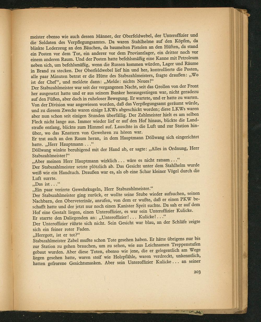 Der Stabszahlmeister ging zurück, er wollte seine Stube wieder aufsuchen, seinen Nachbarn, den Oberveterinär, anrufen, von dem er wußte, daß er einen PKW be- schafft hatte und der jetzt nur noch einen Kanister Sprit Suchte. Da Sah er auf dem Hof eine Gestalt liegen, einen Unteroffizier, es war sein Unteroffizier Kulicke.