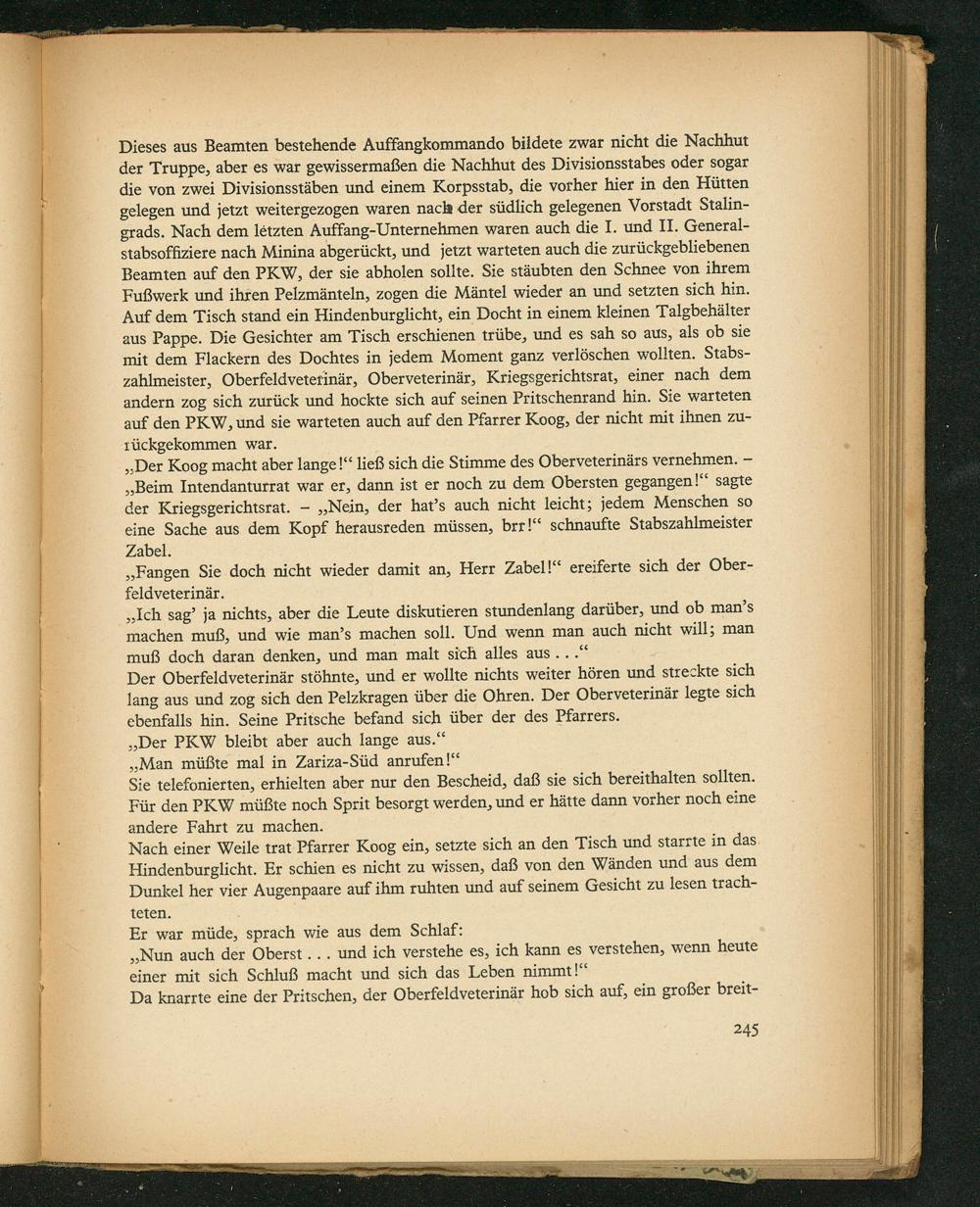 Pieses aus Beamten bestehende Auffangkommando bildete zwar nicht die Nachhut der Truppe, aber es war gewissermaßen die Nachhut des Divisionsstabes oder Sogar die von Zwei Divisionsstãben und einem Korpsstab, die vorher hier in den Hütten gelegen und jetzt weitergezogen waren nack der sůdlich gelegenen Vorstadt Stalin- grads. Mach dem letzten Auffang-Unternehmen waren auch die I. und II. General- Stabsoffiziere nach Minina abgerückt, und jetzt warteten auch die zurückgebliebenen Beamten auf den PKW, der sie abholen sollte. Sie stäubten den Schnee von ihrem Bußwerk und ihren Pelzmãnteln, zogen die Mäntel wieder an und set?ten sich hin. Auf dem Tisch stand ein Hindenburglicht, ein Pocht in einem kleinen Talgbehälter aus Pappe. Die Gesichter am Tisch erschienen trübe, und es sah so aus, als ob sie mit dem Flackern des Dochtes in jedem Moment ganz verlöschen wollten. Stabs- zahlmeister, Oberfeldveterinär, Oberveterinär, Kriegsgerichtsrat, einer nach dem andern zog sich zurück und hockte sich auf seinen Pritschenrand hin. Sie warteten auf den PKW, und sie warteten auch auf den Pfarrer Koog, der nicht mit ihnen zu- rückgekommen war.