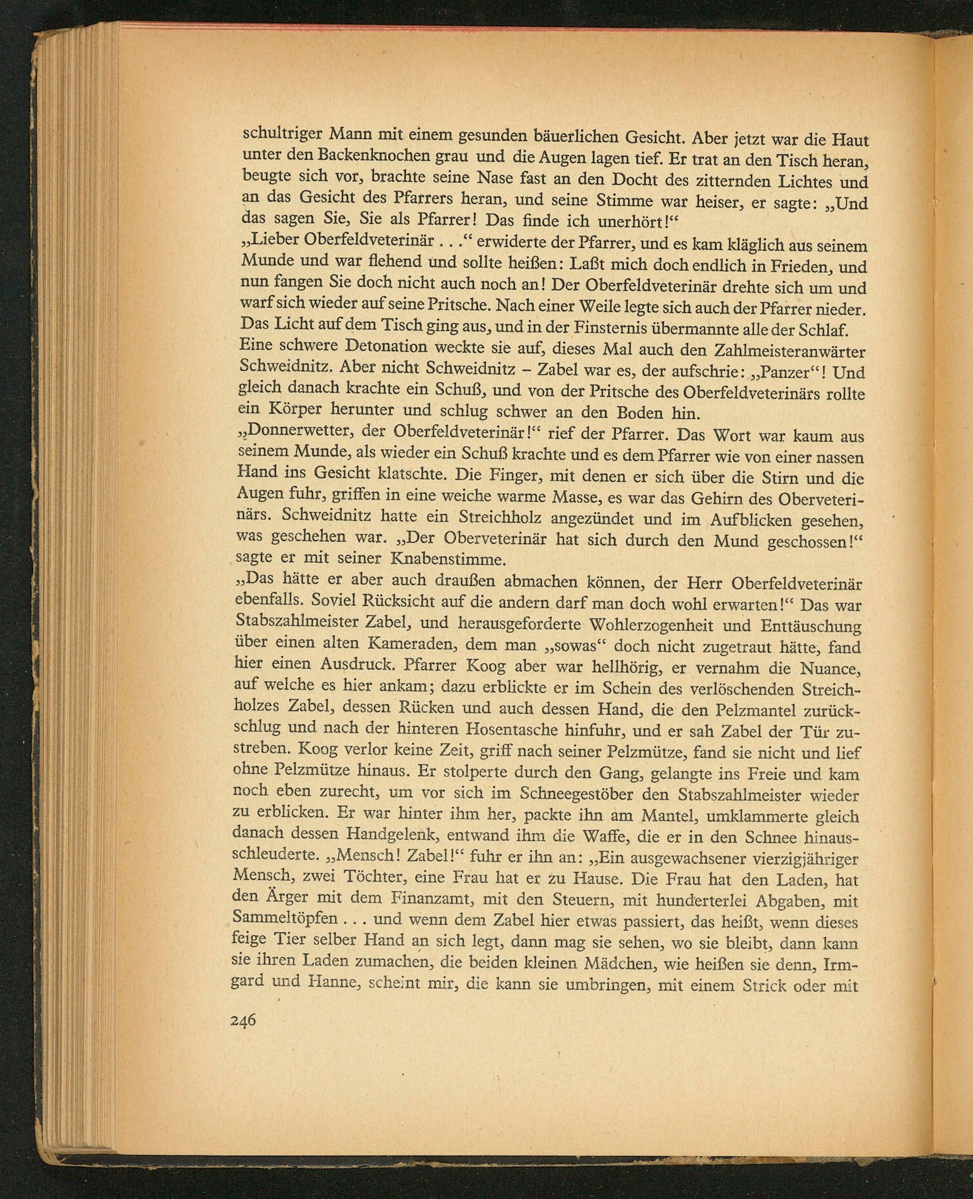 „Lieber Oberfeldveterinär... erwiderte der Pfarrer, und es kam kläglich aus seinem Munde und war flehend und sollte heißen: Laßt mich doch endlich in Frieden, und nun fangen Sie doch nicht auch noch an! Der Oberfeldveterinãr drehte sich um und warf᷑ Sich wieder auf seine Pritsche. Mach einer Weile legte sich auch der Pfarrer nieder. Das Licht auf᷑ dem Tisch ging aus, und in der Finsternis übermannte alle der Schlaf. Fine schwere Detonation weckte sie auf, dieses Mal auch den Zahlmeisteranwärter Schweidnitz. Aber nicht Schweidnitz— Zabel war es, der aufschrie:„Panzer“] Und gleich danach krachte ein Schuß, und von der Pritsche des Oberfeldveterinärs rollte ein Körper herunter und schlug schwer an den Boden hin.