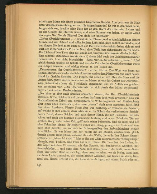 „Das hätte er aber auch draußen abmachen können, der Herr Oberfeldveterinär ebenfalls. Soviel Rücksicht auf die andern darf man doch wohl erwarten]“ Pas war Stabs?ahlmeister Zabel, und herausgeforderte Wohlerzogenheit und Enttäuschung über einen alten Kameraden, dem man„sowas doch nicht zugetraut hätte, fand hier einen Ausdruck. Pfarrer Koog aber war hellhörig, er vernahm die Nuance, auf welche es hier ankam; dazu erblickte er im Schein des verlöschenden Streich- holzes Zabel, dessen Rücken und auch dessen Hand, die den Pelzmantel zurück- schlug und nach der hinteren Hosentasche hinfuhr, und er sah Zabel der Tür zu- streben. Koog verlor keine Zeit, griff nach seiner Pelzmütze, fand sie nicht und lief ohne Pelzmütze hinaus. Er stolperte durch den Gang, gelangte ins Freie und kam noch eben zurecht, um vor sich im Schneegestöber den Stabszahlmeister wieder zu erblicken. Er war hinter ihm her, packte ihn am Mantel, umklammerte gleich danach dessen Handgelenk, entwand ihm die Waffe, die er in den Schnee hinaus- schleuderte.„Mensch! Zabel!“ fuhr er ihn an:„Ein ausgewachsener vierzigjähriger Mensch, zwei Töchter, eine Frau hat er zu Hause. Die Frau hat den Laden, hat den Arger mit dem Finanzamt, mit den Steuern, mit hunderterlei Abgaben, mit Sammeltõpfen und wenn dem Zabel hier etwas Passiert, das heißt, wenn dieses feige Tier selber Hand an sich legt, dann mag sie sehen, wo sie bleibt, dann kann sie ihren Laden zumachen, die beiden kleinen Mädchen, wie heißen sie denn, Irm- gard und Hanne, scheint mir, die kann sie umbringen, mit einem Strick oder mit