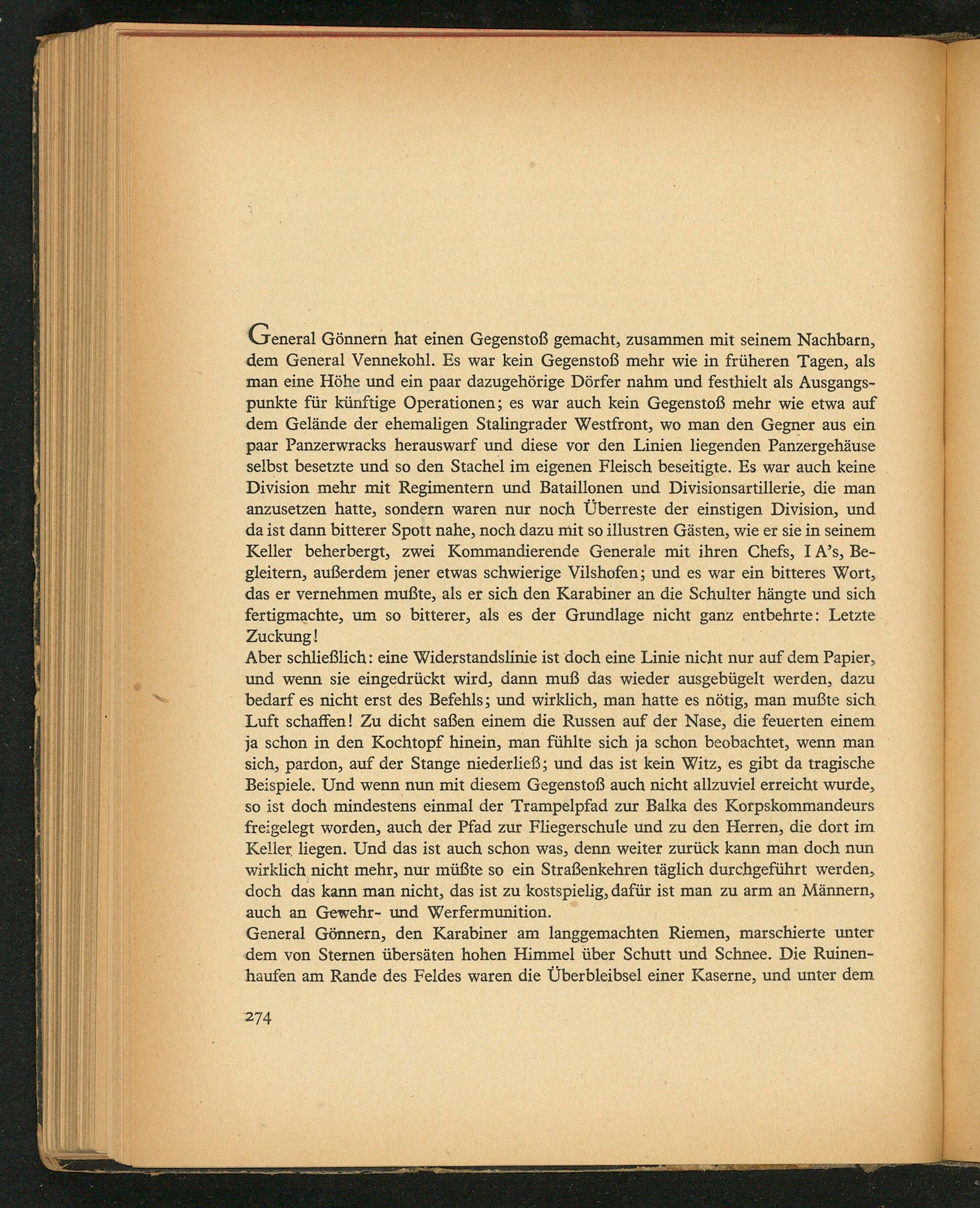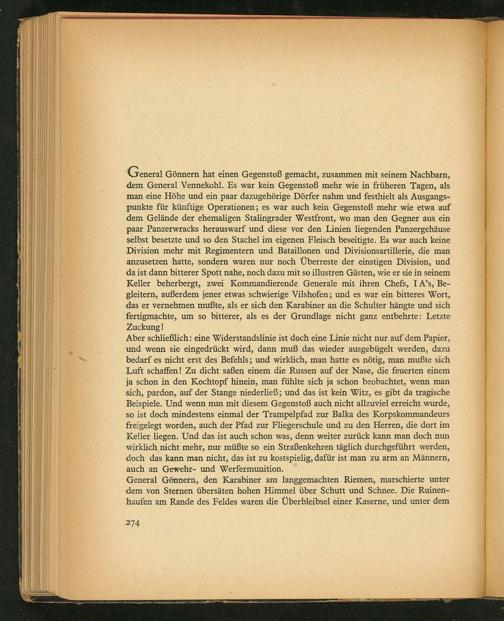 Genera Gönnern hat einen Gegenstoß gemacht, zusammen mit seinem Machbarn, dem General Vennekohl. Es war kein Gegenstoß mehr wie in früheren Tagen, als man eine Höhe und ein paar dazugehörige Dörfer nahm und festhielt als Ausgangs- punkte für künftige Operationen; es war auch kein Gegenstoß mehr wie etwa auf dem Gelände der ehemaligen Stalingrader Westfront, wo man den Gegner aus ein paar Pan?erwracks herauswarf und diese vor den Linien liegenden Panzergehäuse selbst besetzte und so den Stachel im eigenen Fleisch beseitigte. Es war auch keine Division mehr mit Regimentern und Bataillonen und Divisionsartillerie, die man an?usetzen hatte, sondern waren nur noch Uberreste der einstigen Division, und da ist dann bitterer Spott nahe, noch dazu mit so illustren Gãsten, wie er sie in seinem Keller beherbergt, zwei Kommandierende Generale mit ihren Chefs, I A's, Be- gleitern, außerdem jener etwas schwierige Vilshofen; und es war ein bitteres Wort, das er vernehmen mußte, als er sich den Karabiner an die Schulter hängte und sich fertigmachte, um so bitterer, als es der Grundlage nicht ganz entbehrte: Letzte Zuckung!