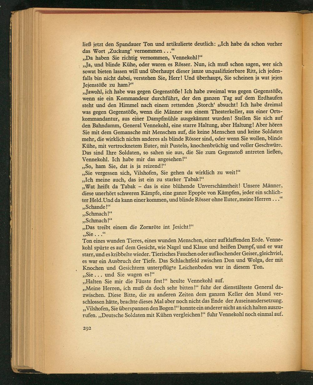 „Jawohl, ich habe was gegen Gegenstöße! Ich habe zweimal was gegen Gegenstöße, wenn sie ein Kommandeur durchführt, der den ganzen Tag auf dem Erdhaufen steht und den Himmel nach einem rettenden Storch“ absucht! Ich habe dreimal was gegen Gegenstöße, wenn die Männer aus einem Theaterkeller, aus einer Orts- kommandantur, aus einer Dampfmühle ausgekämmt wurden! Stellen Sie sich auf den Bahndamm, General Vennekohl, eine starre Haltung, aber Haltung! Aber hören Sie mit dem Gemansche mit Menschen auf, die keine Menschen und keine Soldaten mehr, die wirklich nichts anderes als blinde Rõsser sind, oder wenn Sie wollen, blinde Kühe, mit vertrocknetem Euter, mit Pusteln, knochenbrüchig und voller Geschwüre. Das sind Ihre Soldaten, so sahen sie aus, die Sie zum Gegenstoß antreten ließen, Vennekohl. Ich habe mir das angesehen!“