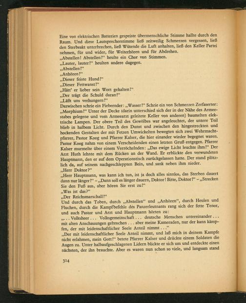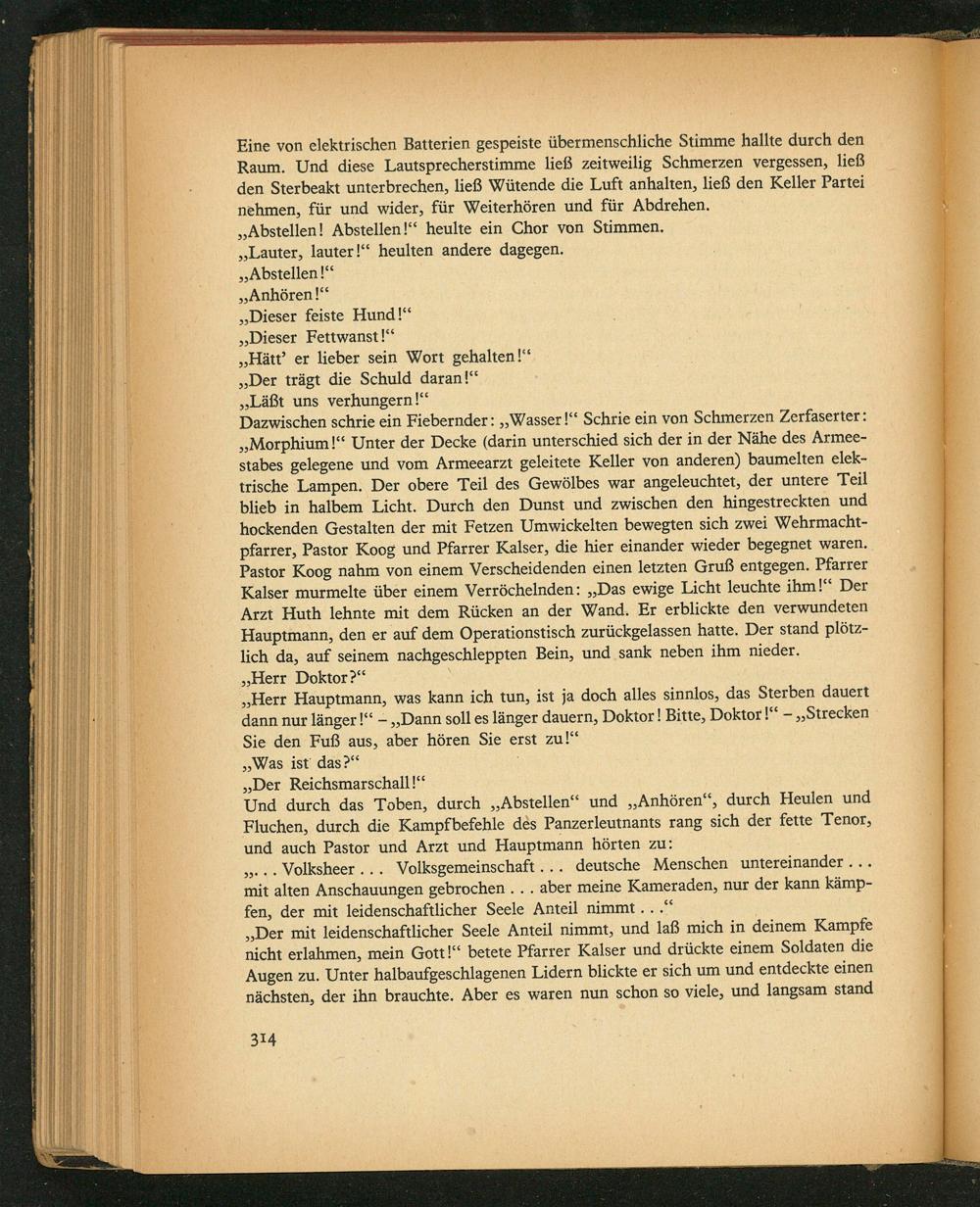 Dazwischen schrie ein Fiebernder:„Wasser!“ Schrie ein von Schmerzen Zerfaserter: „Morphium!“ Unter der Decke(darin unterschied sich der in der Nähe des Armee- stabes gelegene und vom Armeearzt geleitete Keller von anderen) baumelten elek- trische Lampen. Der obere Teil des Gewölbes war angeleuchtet, der untere Teil blieb in halbem Licht. Durch den Dunst und zwischen den hingestreckten und hockenden Gestalten der mit Fetzen Umwickelten bewegten sich zwei Wehrmacht- pfarrer, Pastor Koog und Pfarrer Kalser, die hier einander wieder begegnet waren. Pastor Koog nahm von einem Verscheidenden einen letzten Gruß entgegen. Pfarrer Kalser murmelte über einem Verröchelnden:„Das ewige Licht leuchte ihm!“ Der